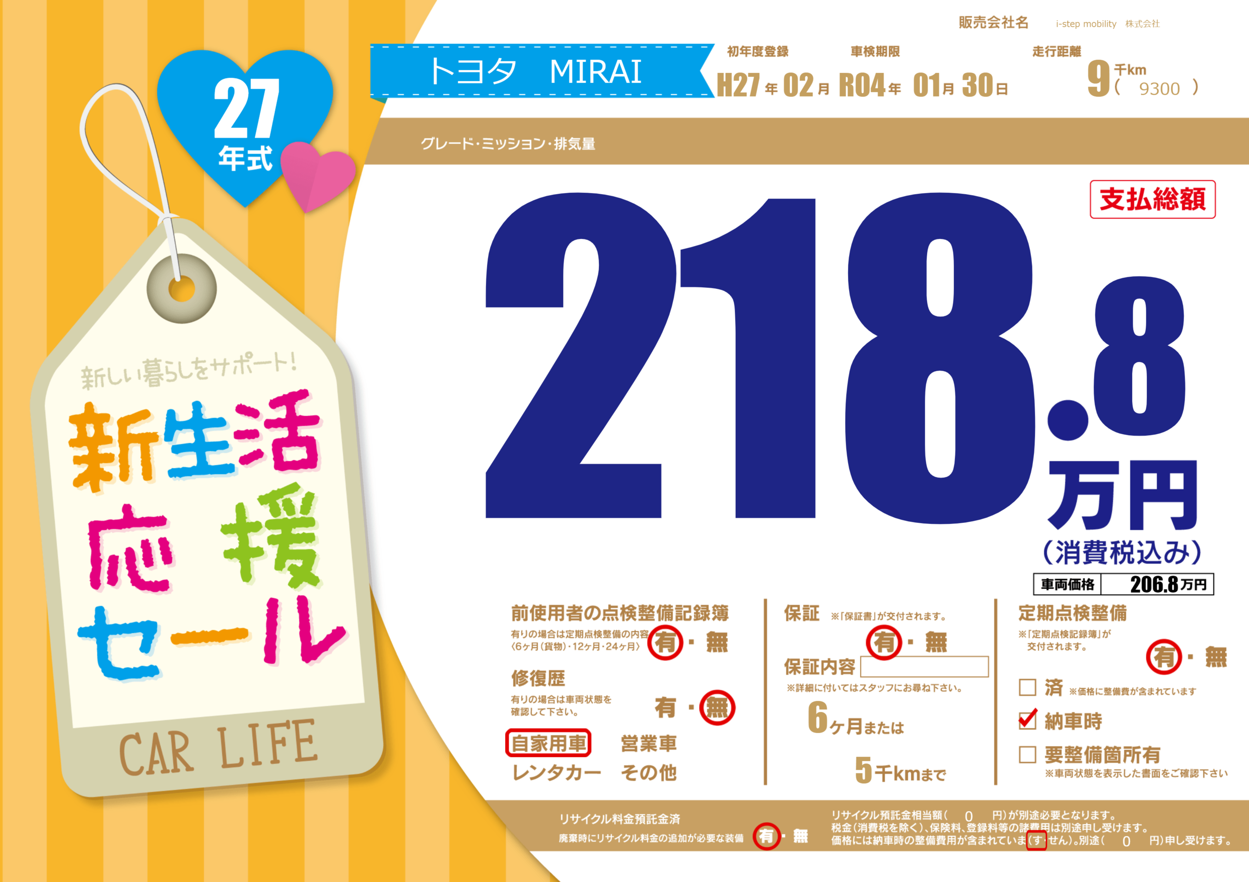| 車名 | トヨタ MIRAI | グレード ミッション 排気量 |