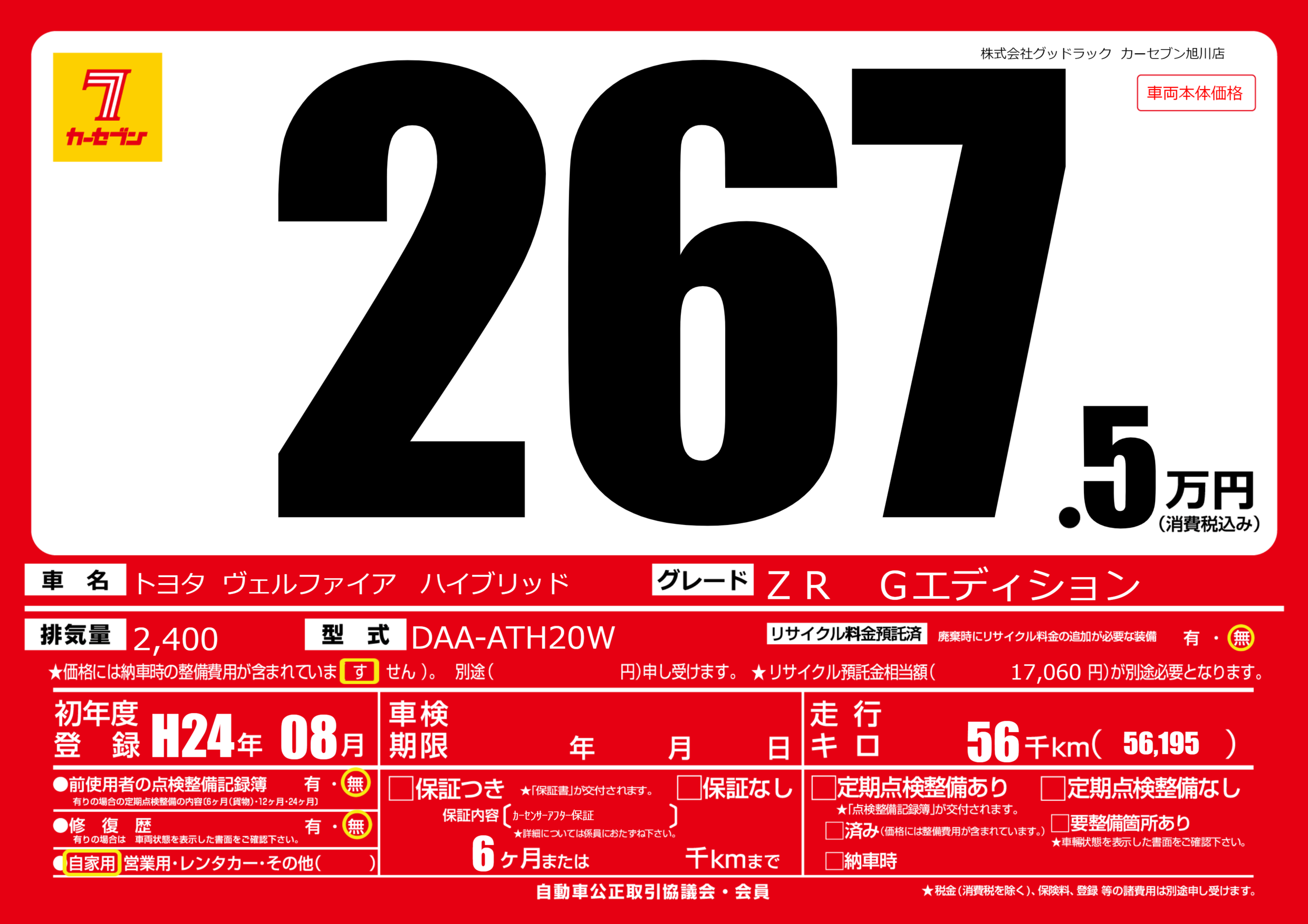 | 車名 | トヨタ ヴェルファイア ハイブリッド | グレード ミッション 排気量 |