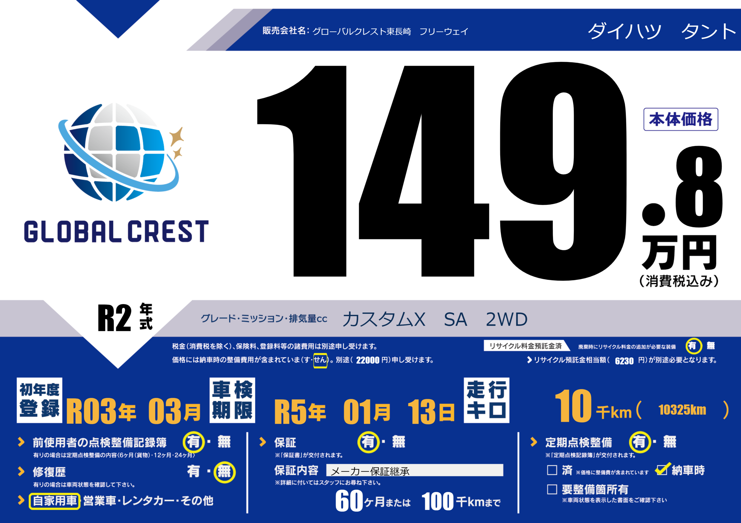 | 車名 | ダイハツ タント | グレード ミッション 排気量 |