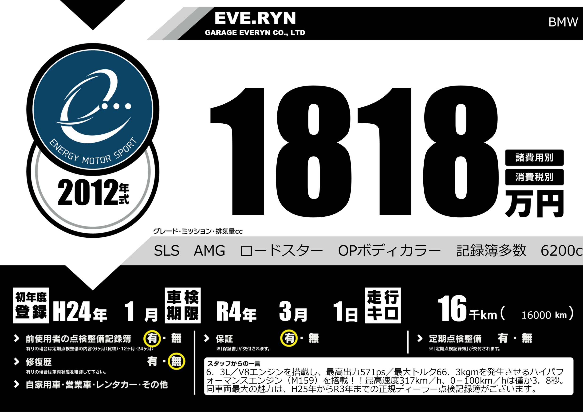 SLS AMG ロードスター OPボディカラー 記録簿多数 6200cc |