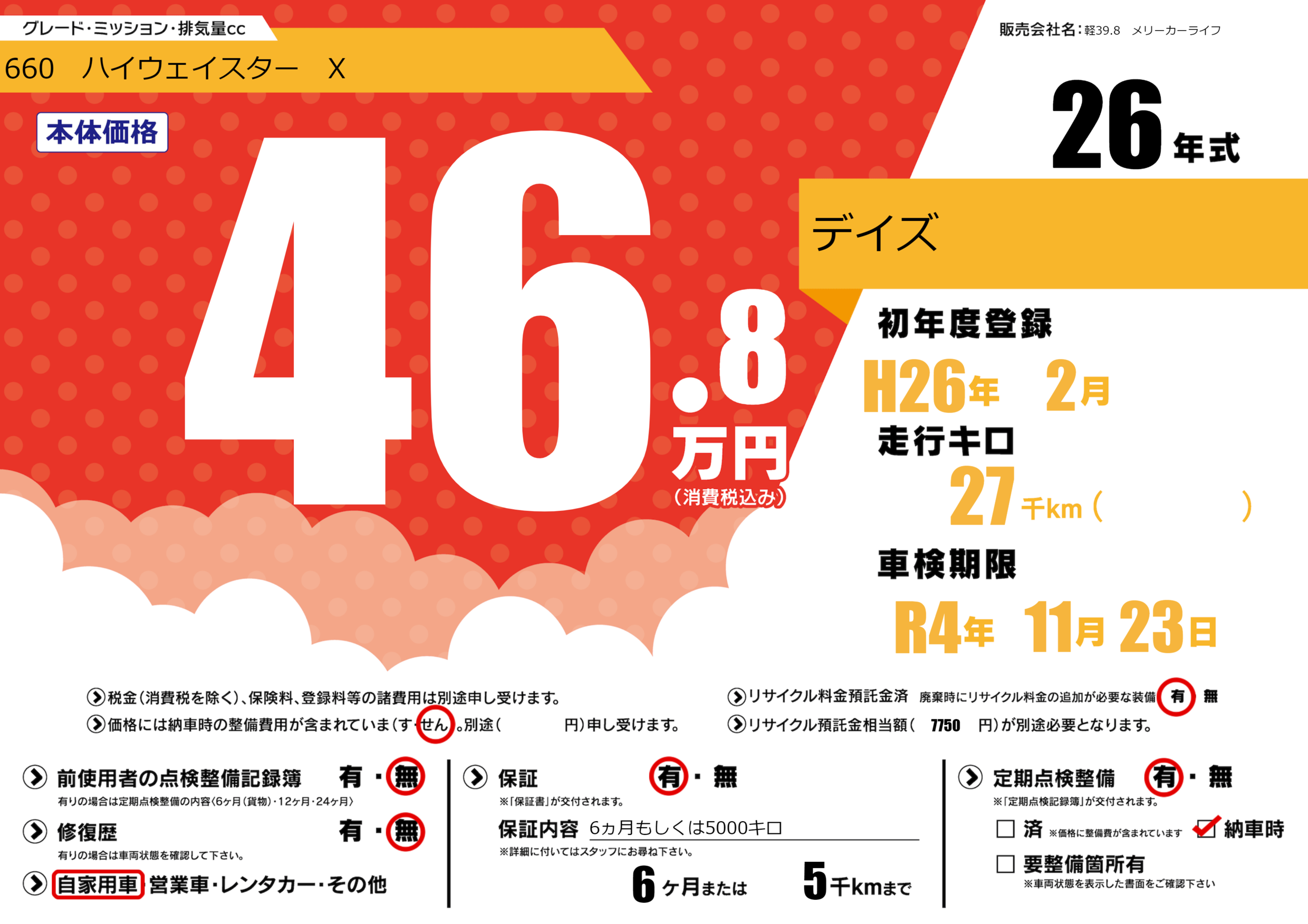 | 車名 | デイズ | グレード ミッション 排気量 |