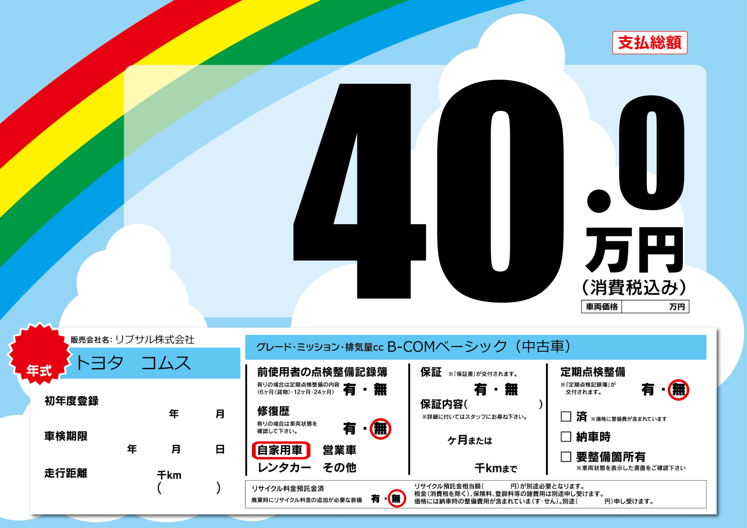 | 車名 | トヨタ コムス | グレード ミッション 排気量 |