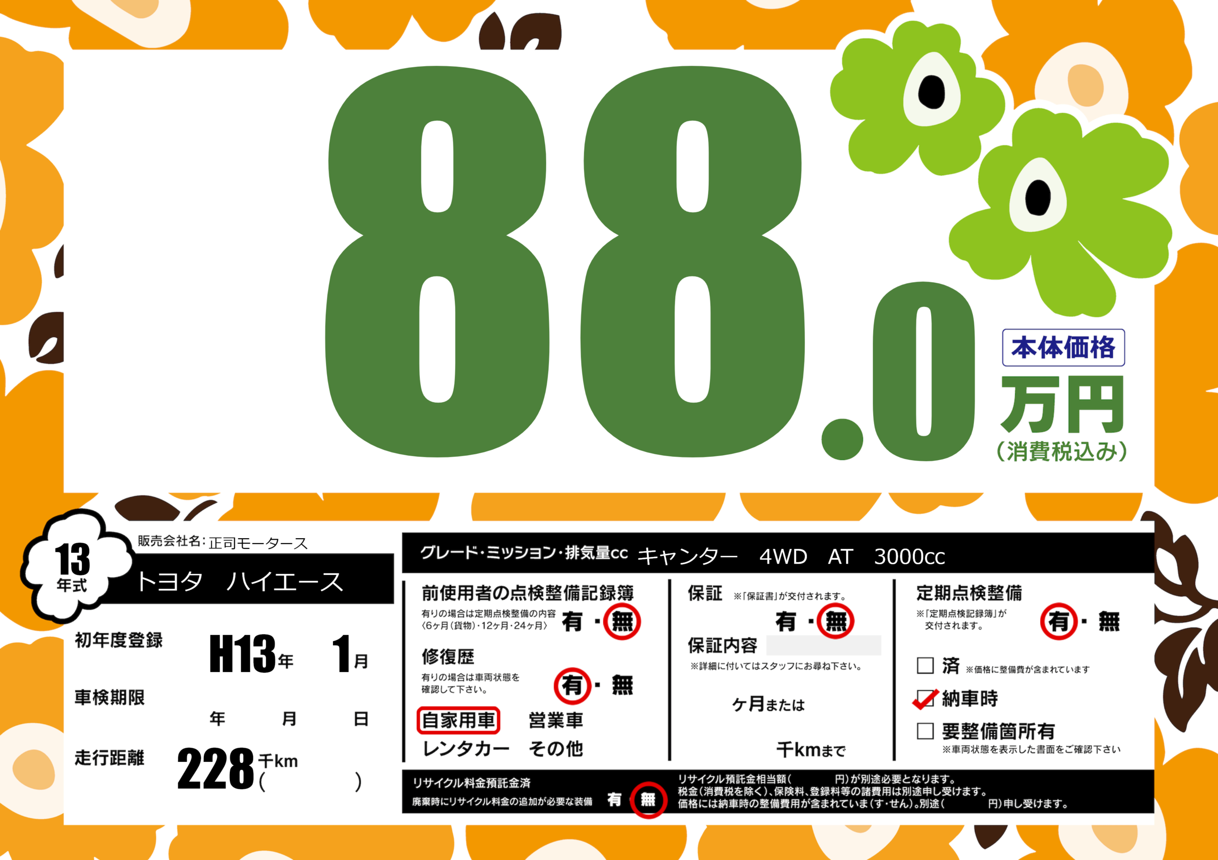 | 走行キロ | 22.8万km | 初年度登録 | H13年1月 |