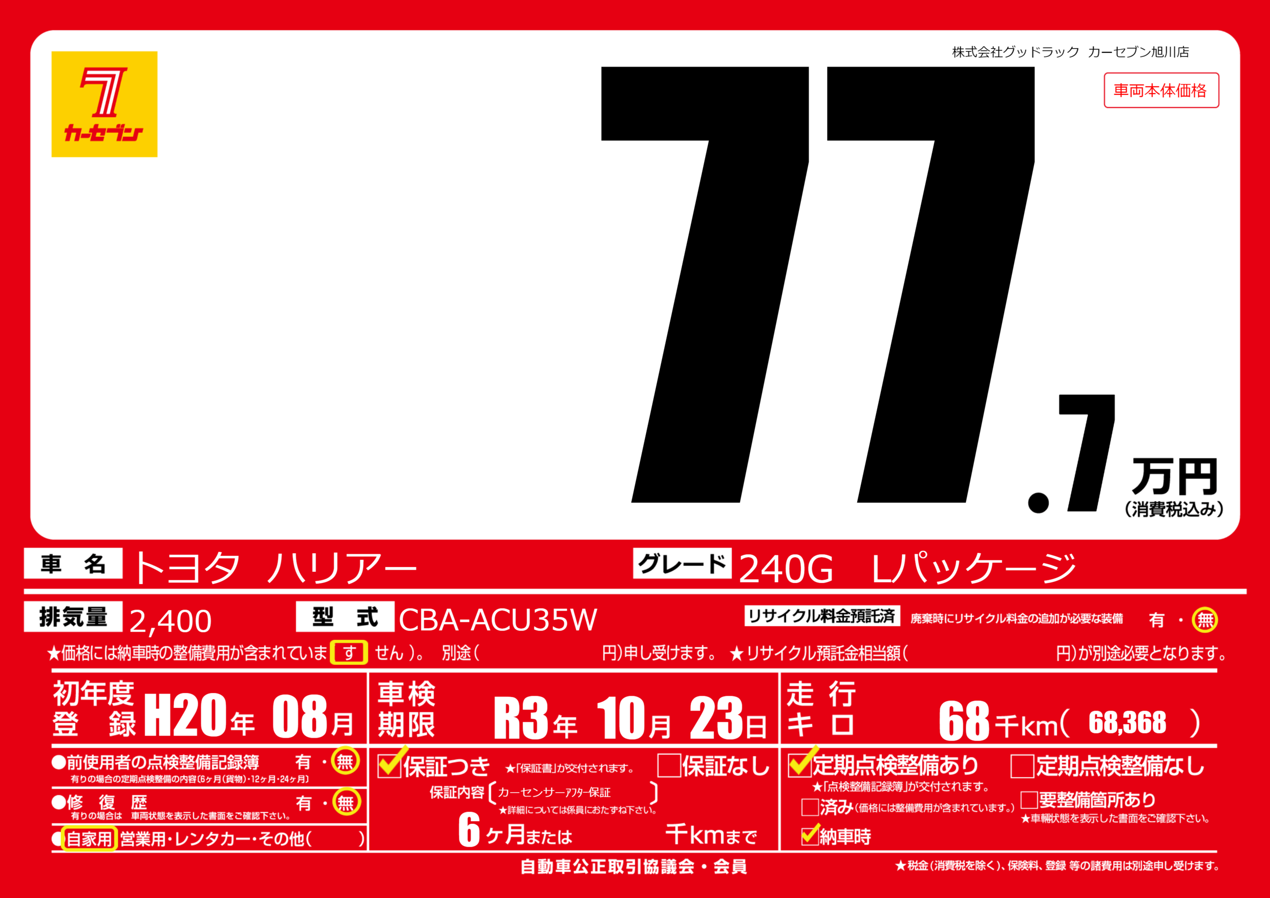 | 走行キロ | 6.8万km | 初年度登録 | H20年08月 |