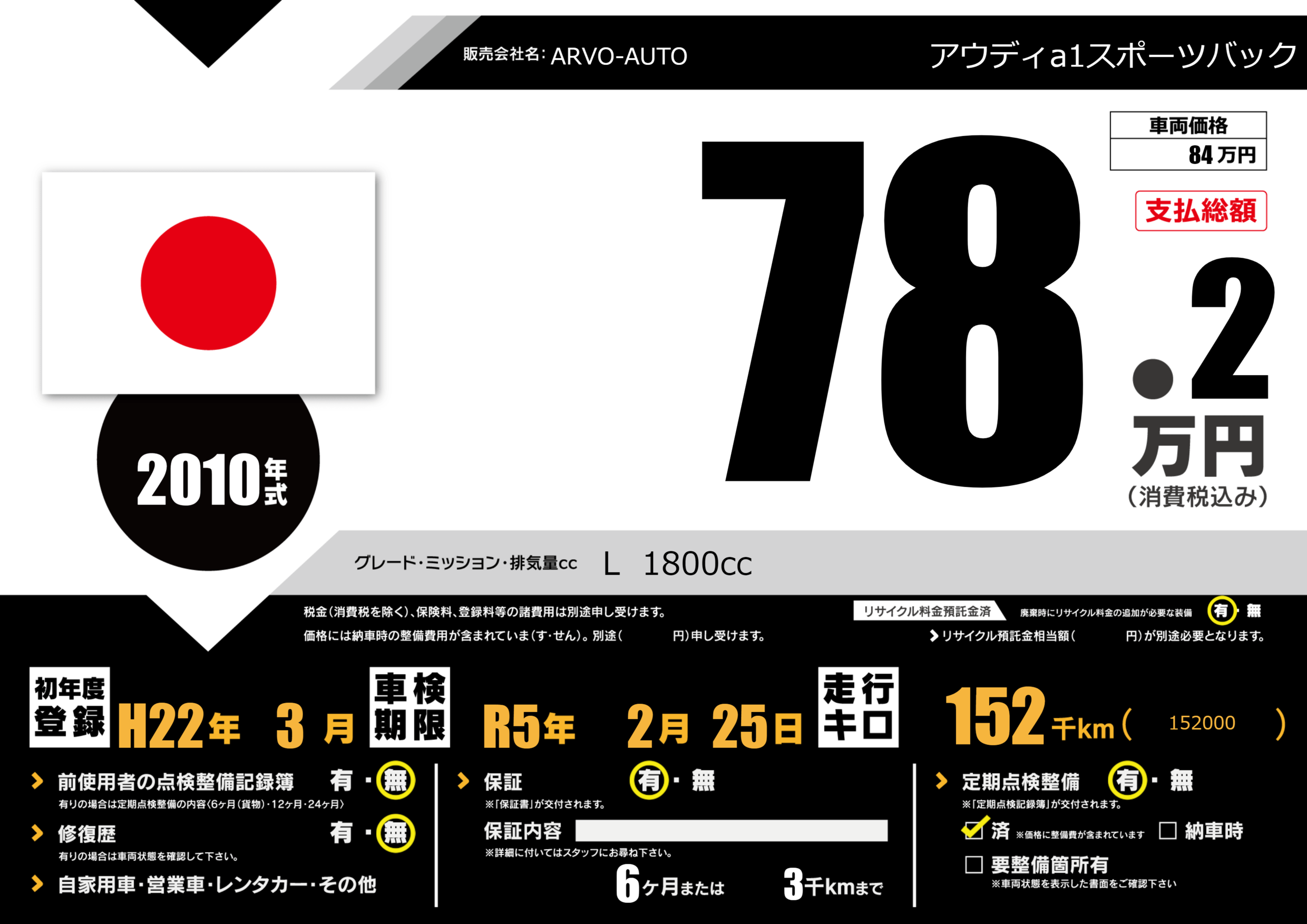 | 車名 | アウディa1スポーツバック | グレード ミッション 排気量 |