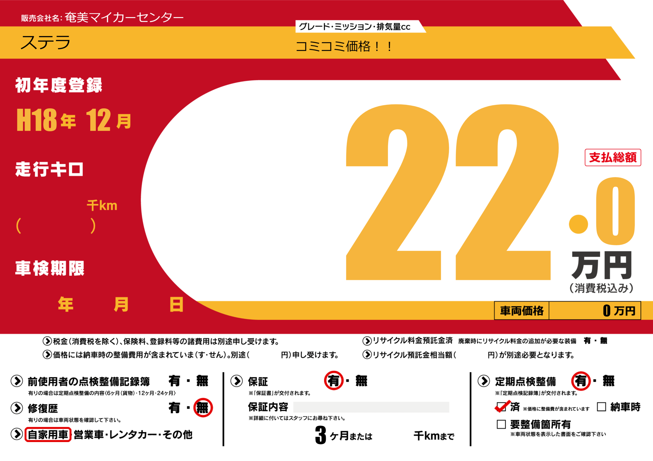 | 定期点検整備 | 定期点検整備あり 定期点検整備済み | ||