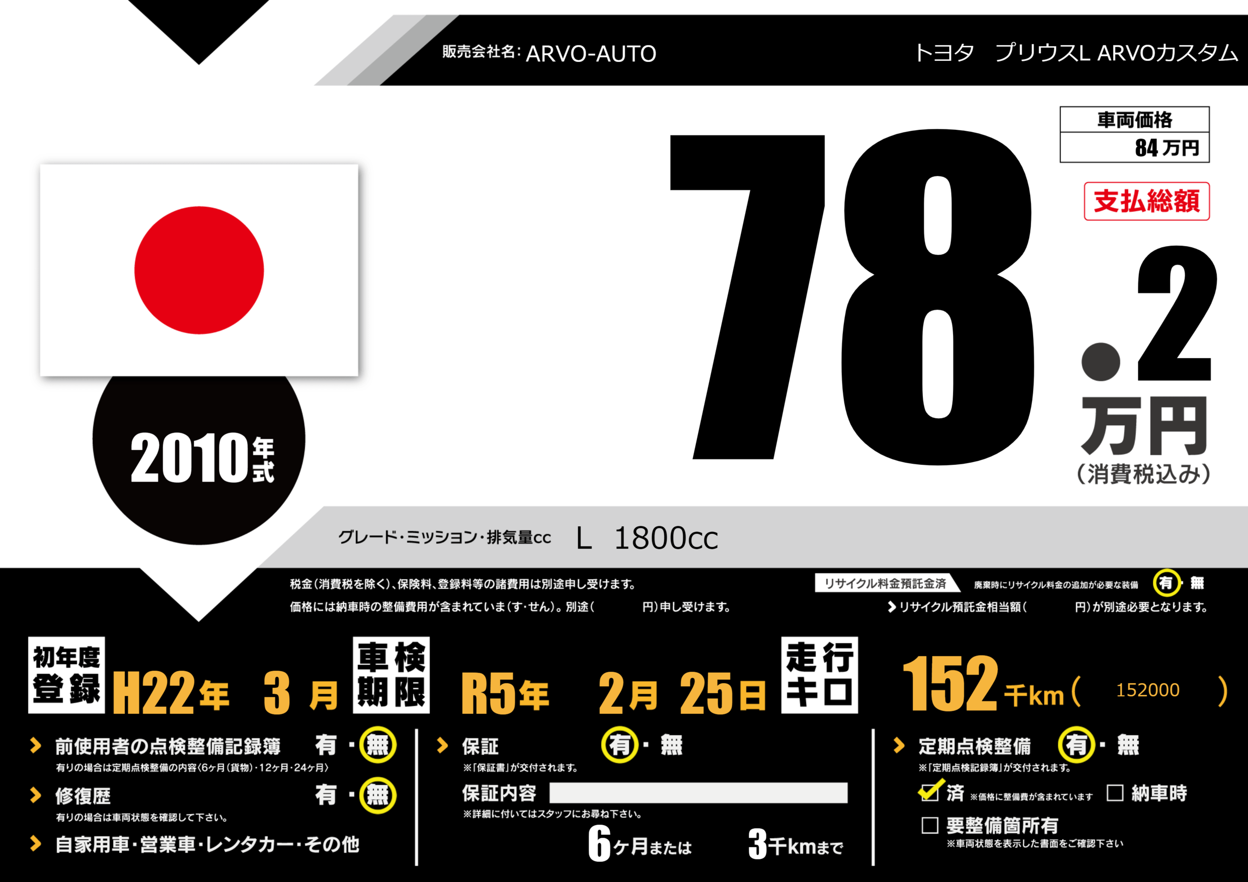 | 車名 | トヨタ プリウスL ARVOカスタム | グレード ミッション 排気量 |