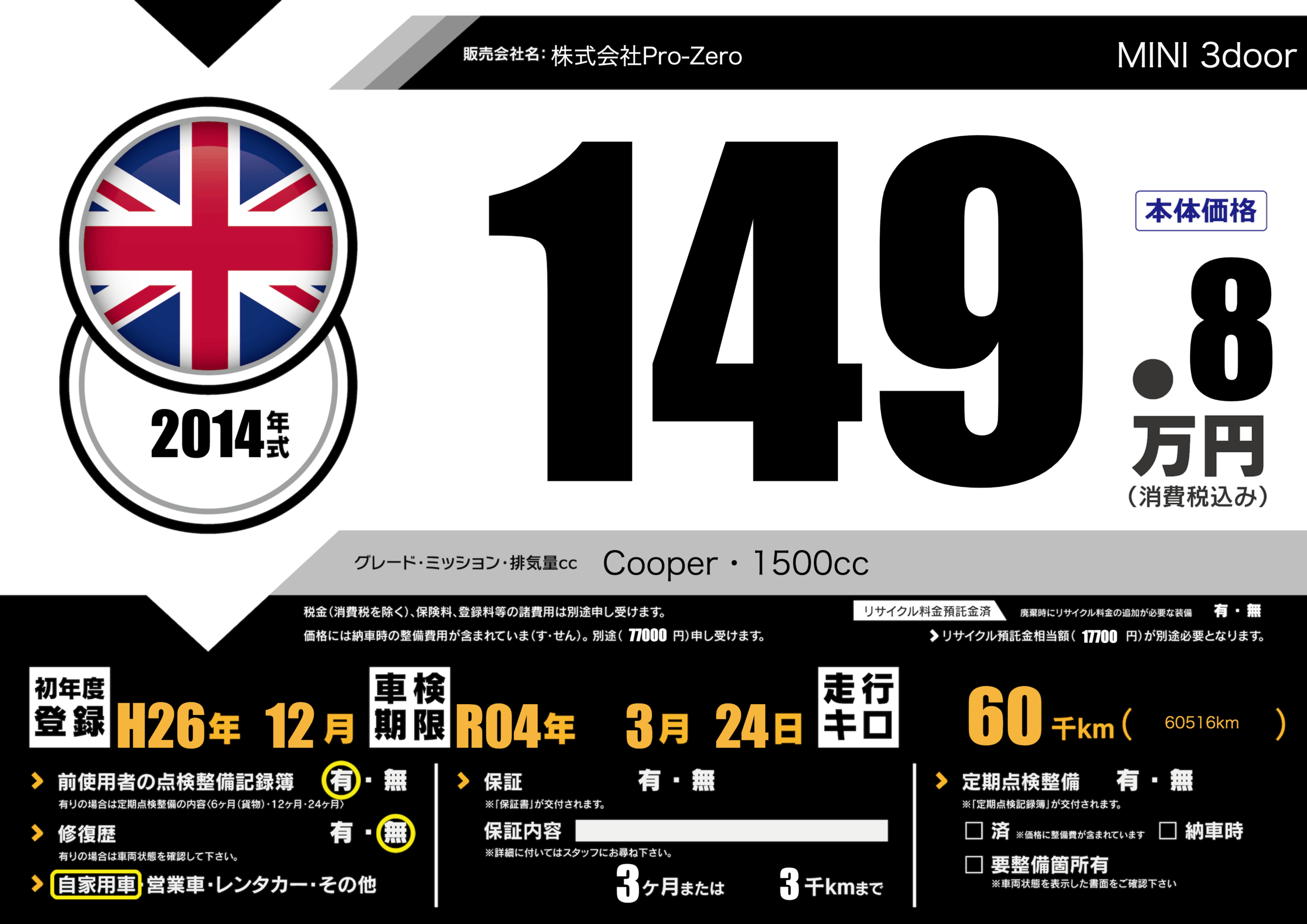 | 車名 | MINI 3door | グレード ミッション 排気量 |