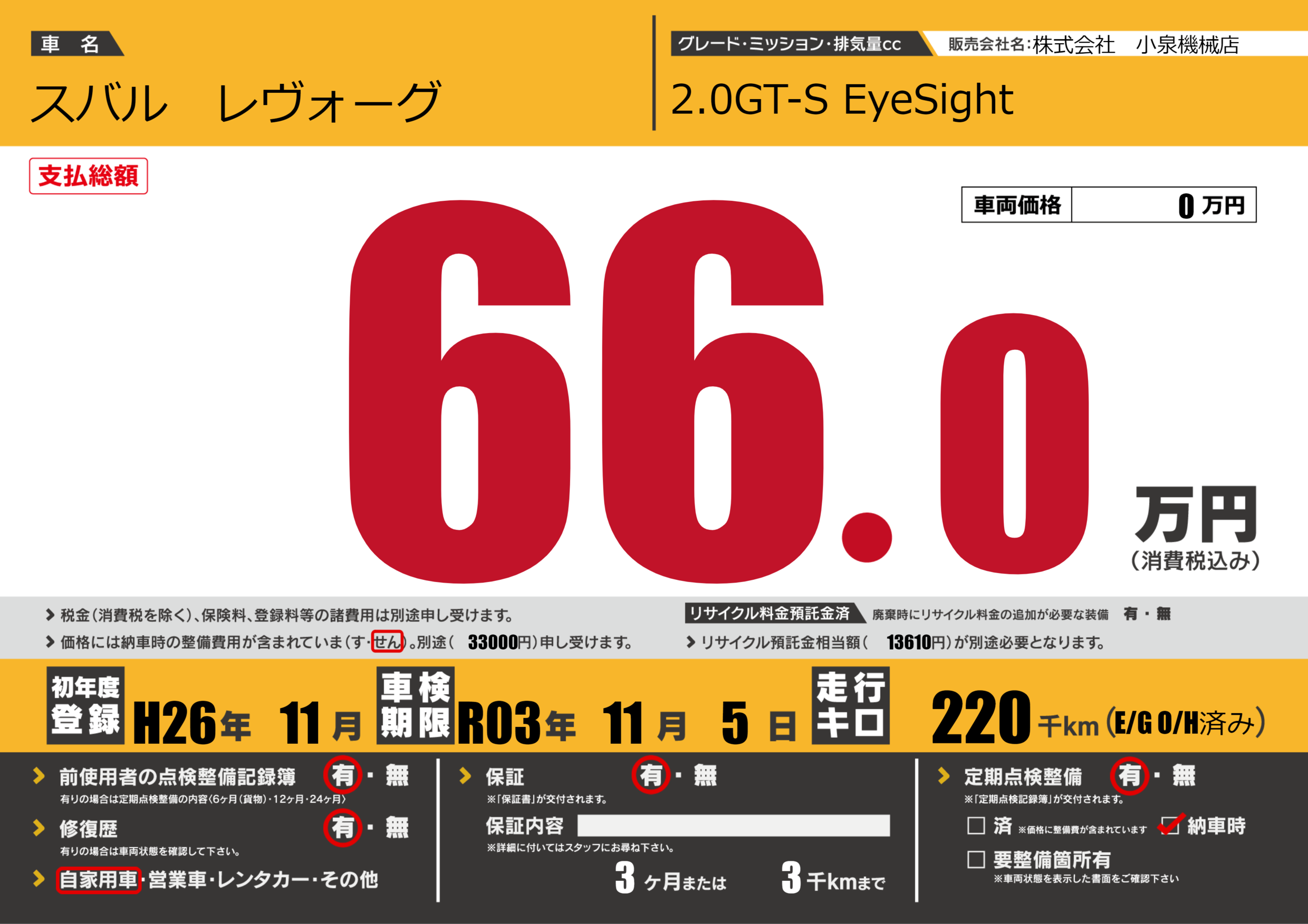 | 車名 | スバル レヴォーグ | グレード ミッション 排気量 |