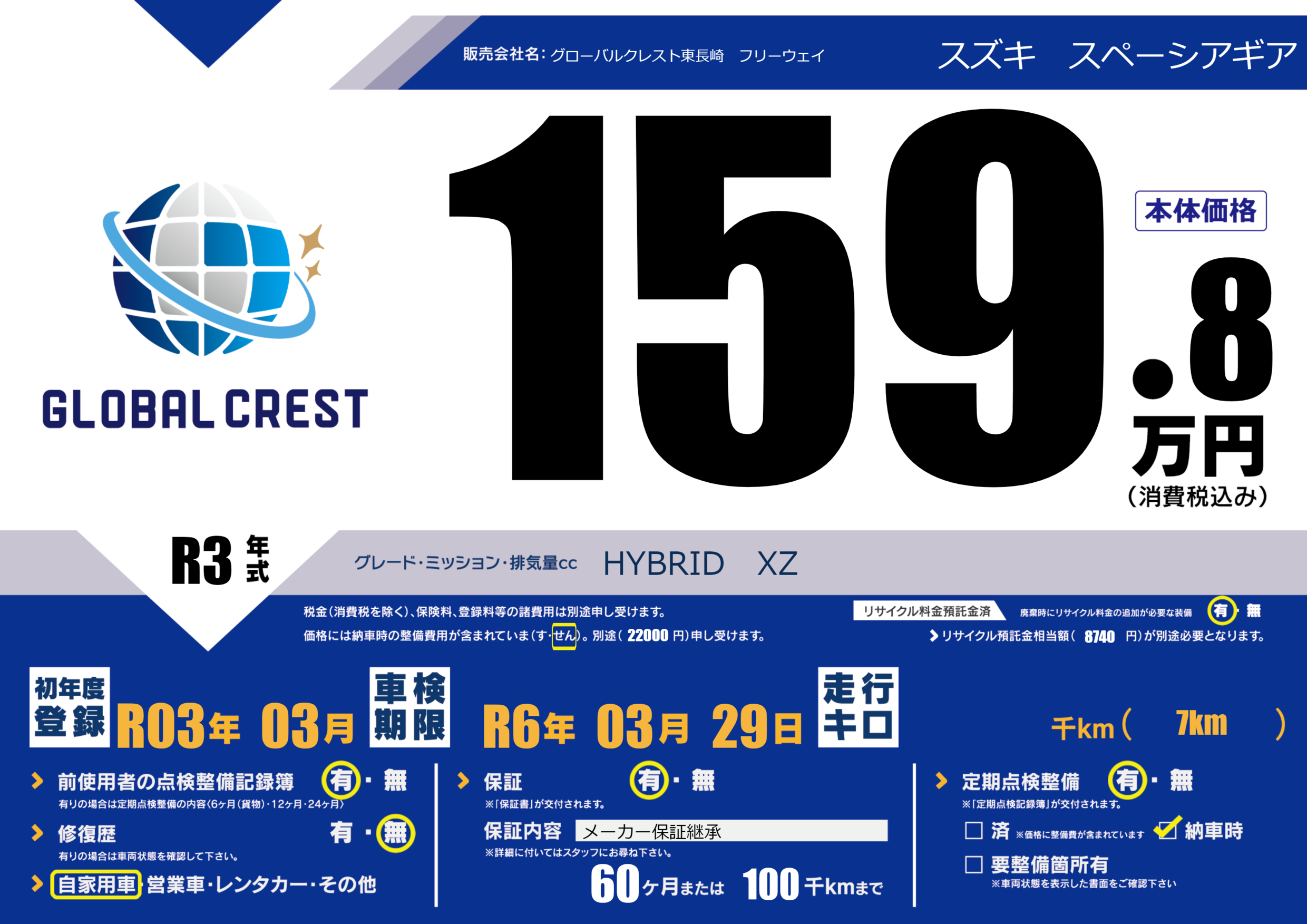 | 定期点検整備 | 定期点検整備あり 納車時あり | ||