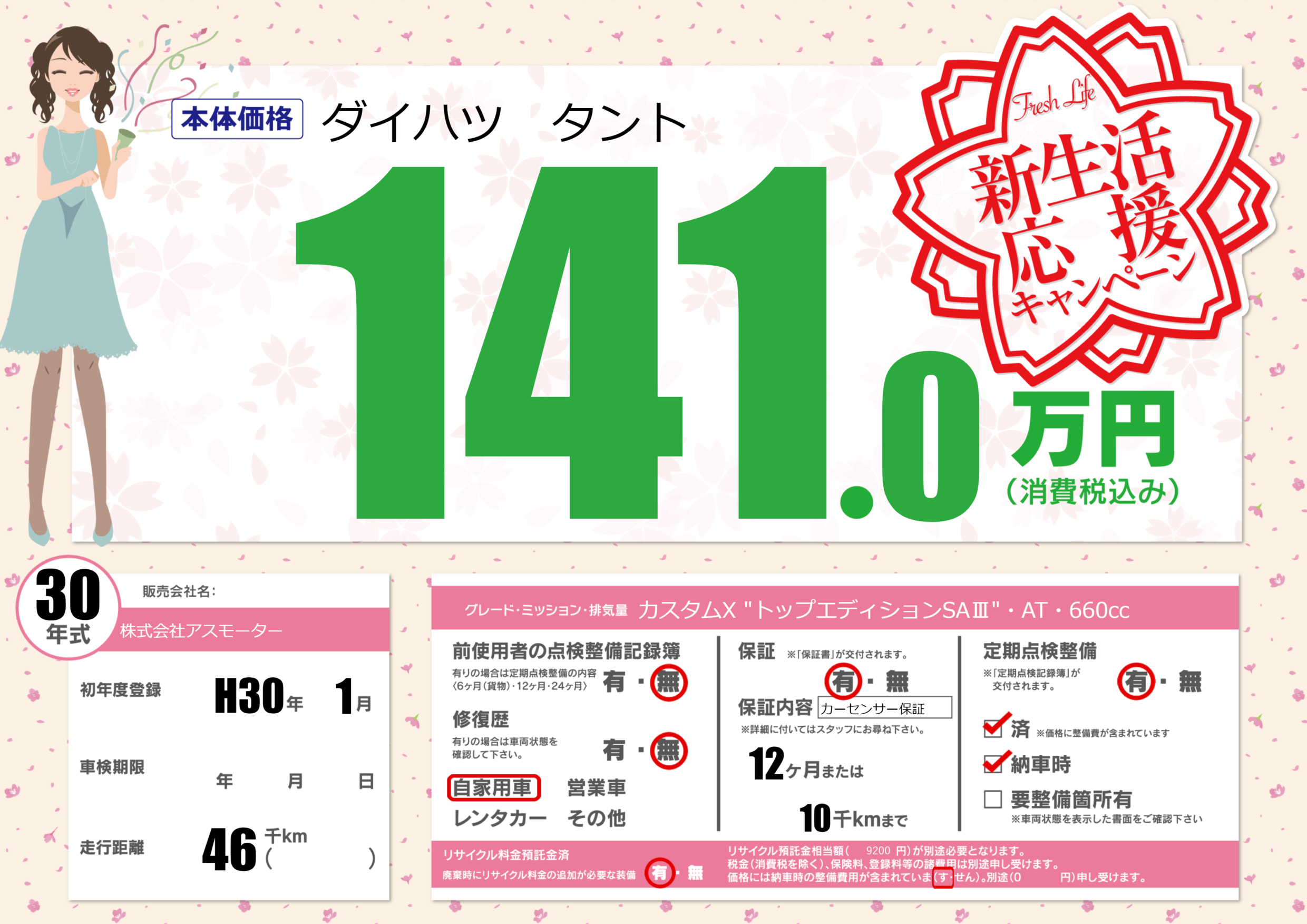 | 定期点検整備 | 定期点検整備あり 定期点検整備済み 納車時あり | ||
