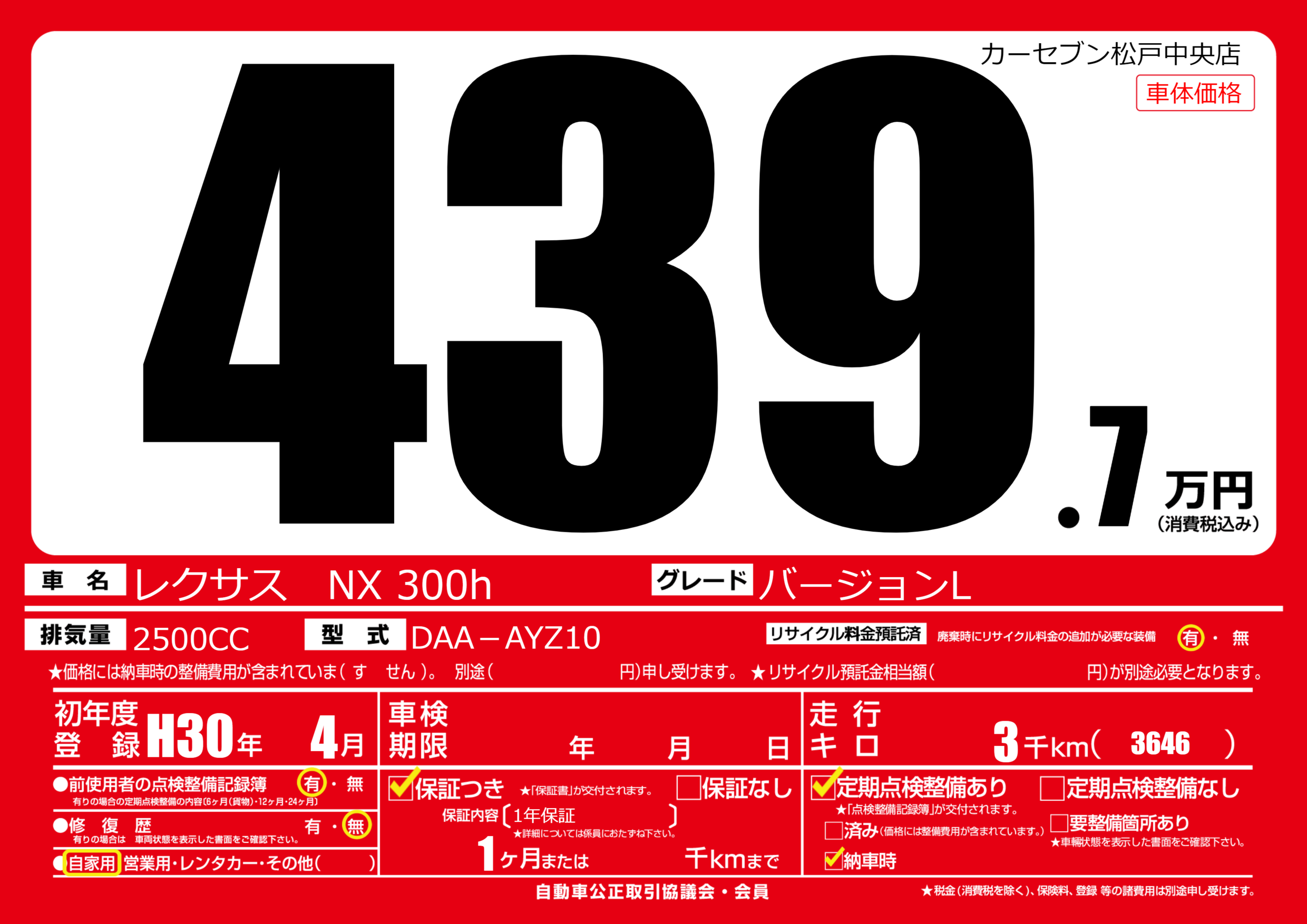 | 車名 | レクサス NX 300h | グレード ミッション 排気量 |