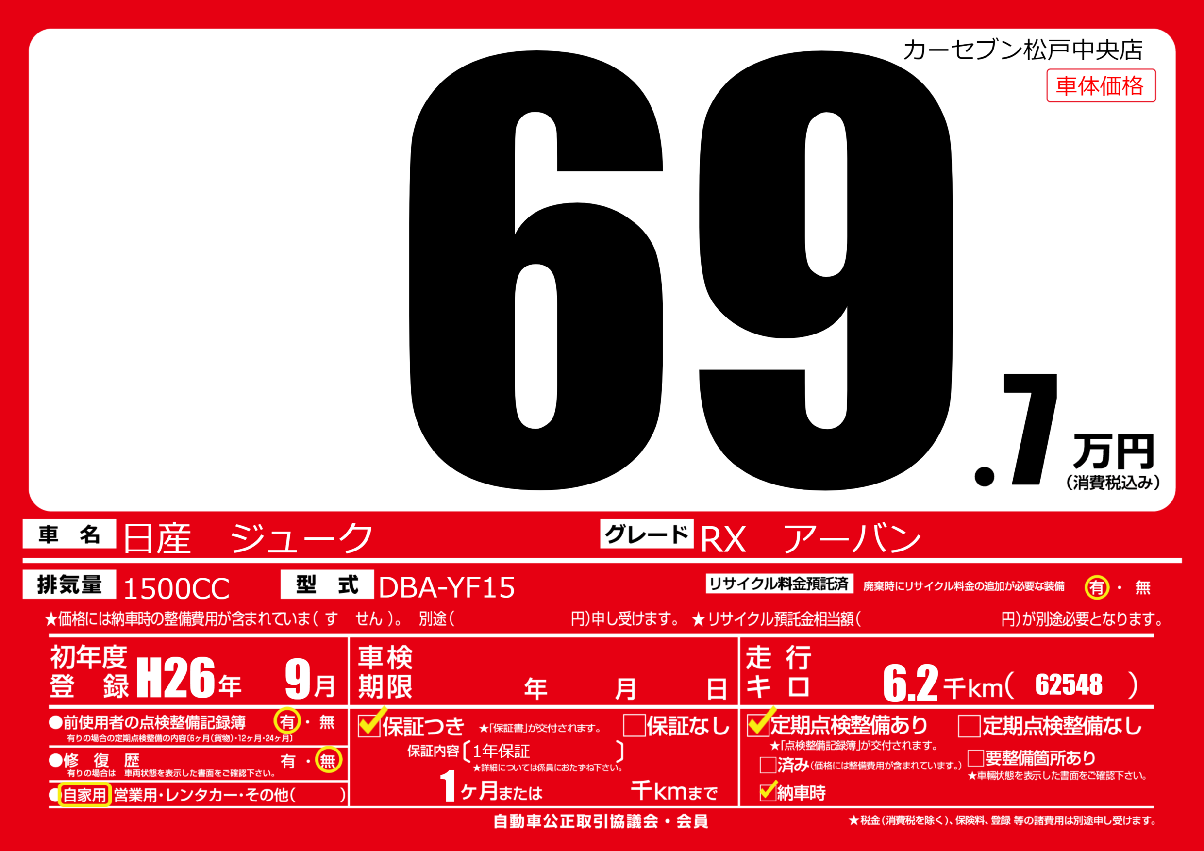 | 車名 | 日産 ジューク | グレード ミッション 排気量 |
