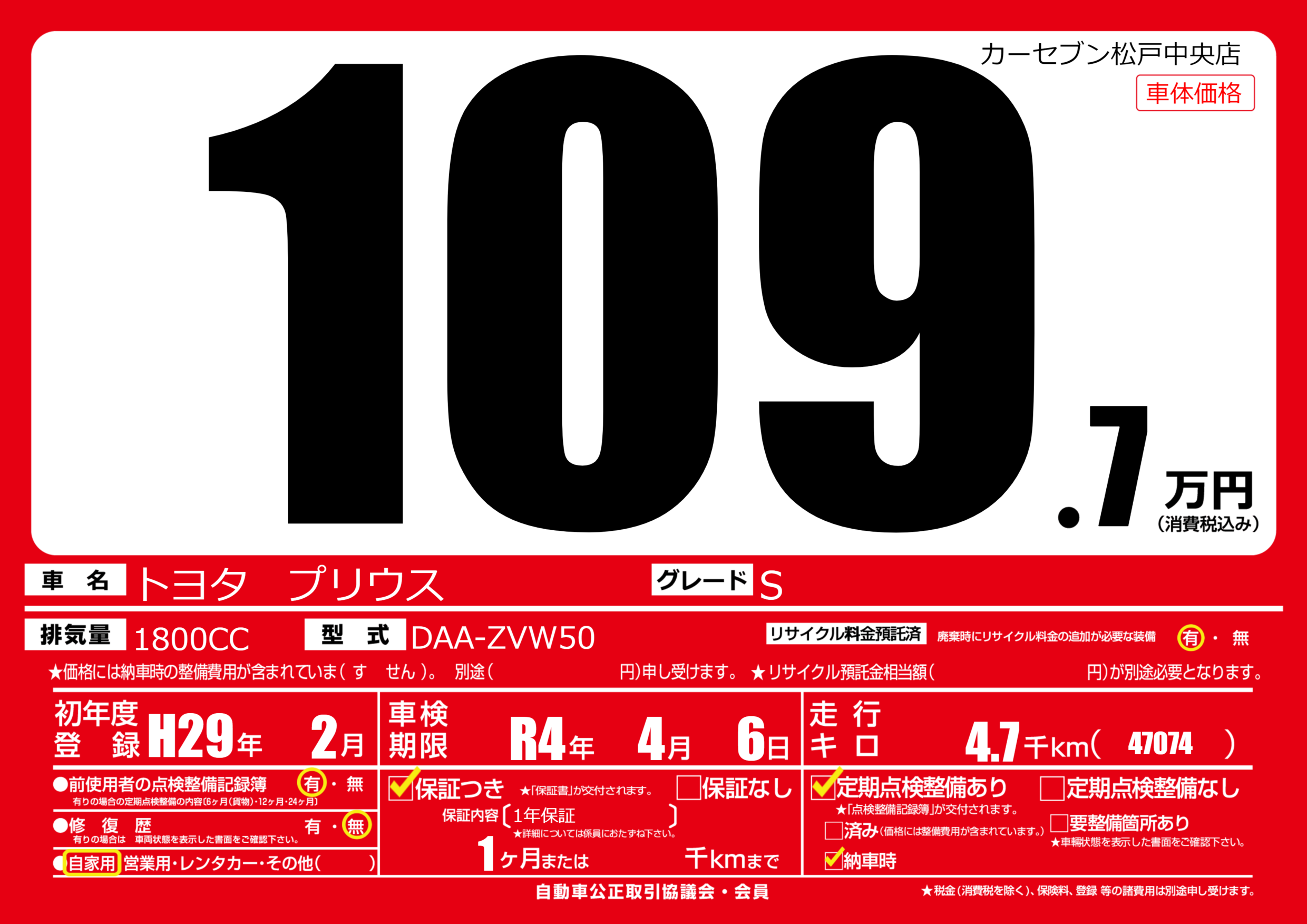 | 車名 | トヨタ プリウス | グレード ミッション 排気量 |