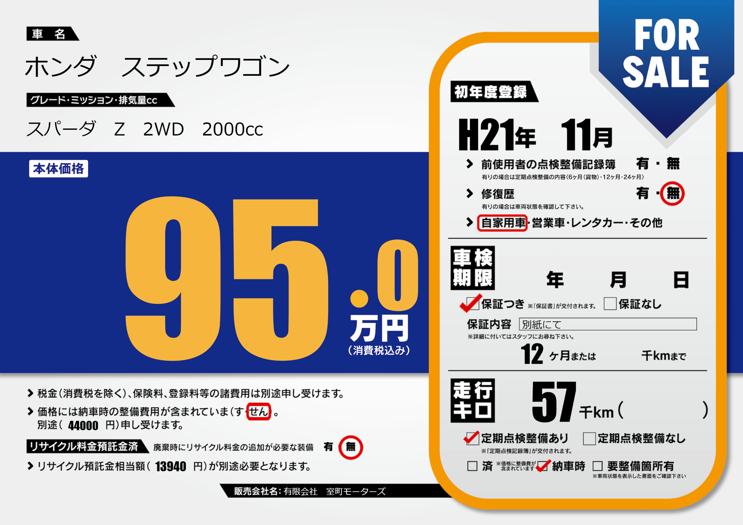 保証付き 保証内容(別紙にて) 12ヶ月または()千kmまで |