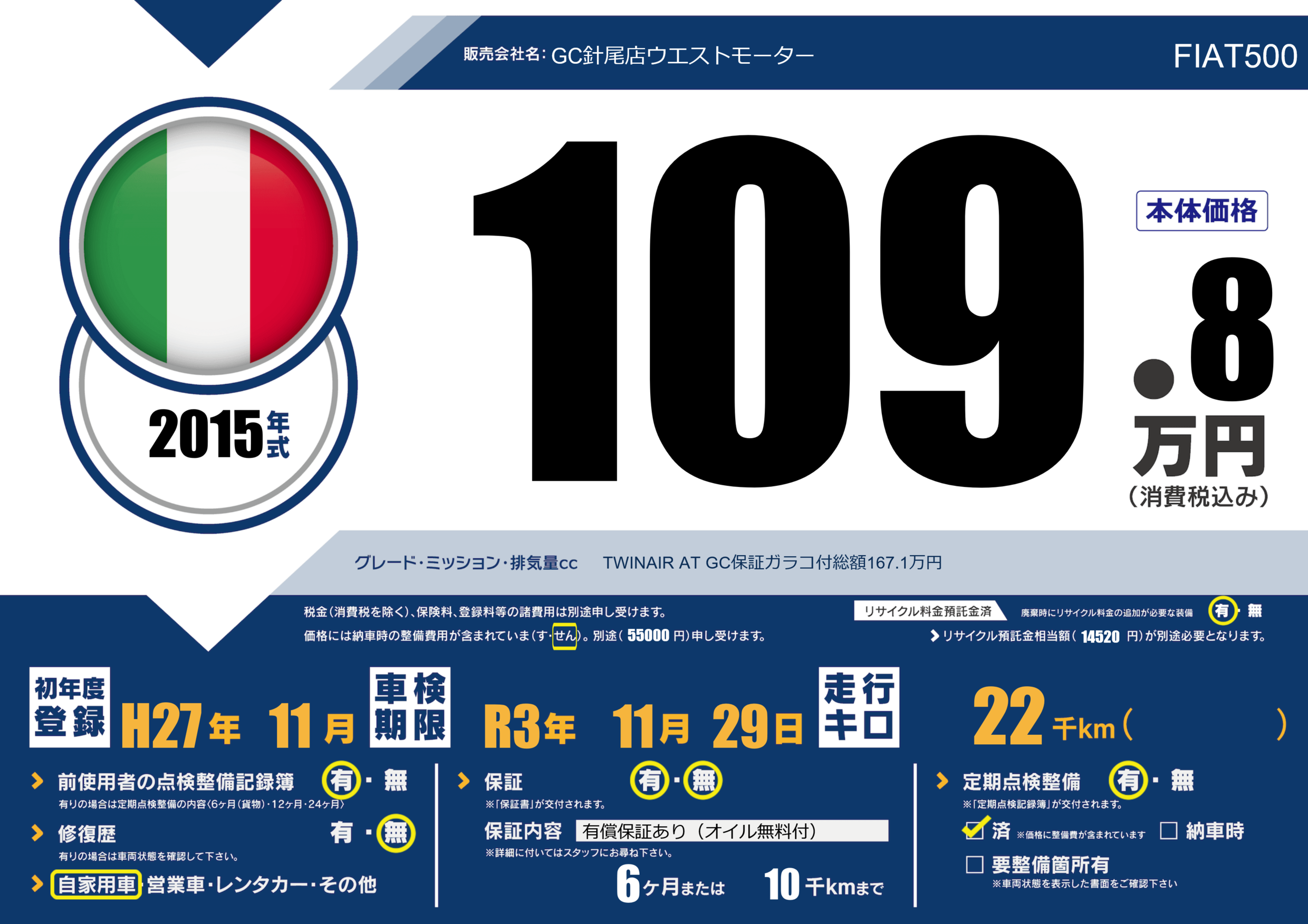 | 車名 | FIAT500 | グレード ミッション 排気量 |