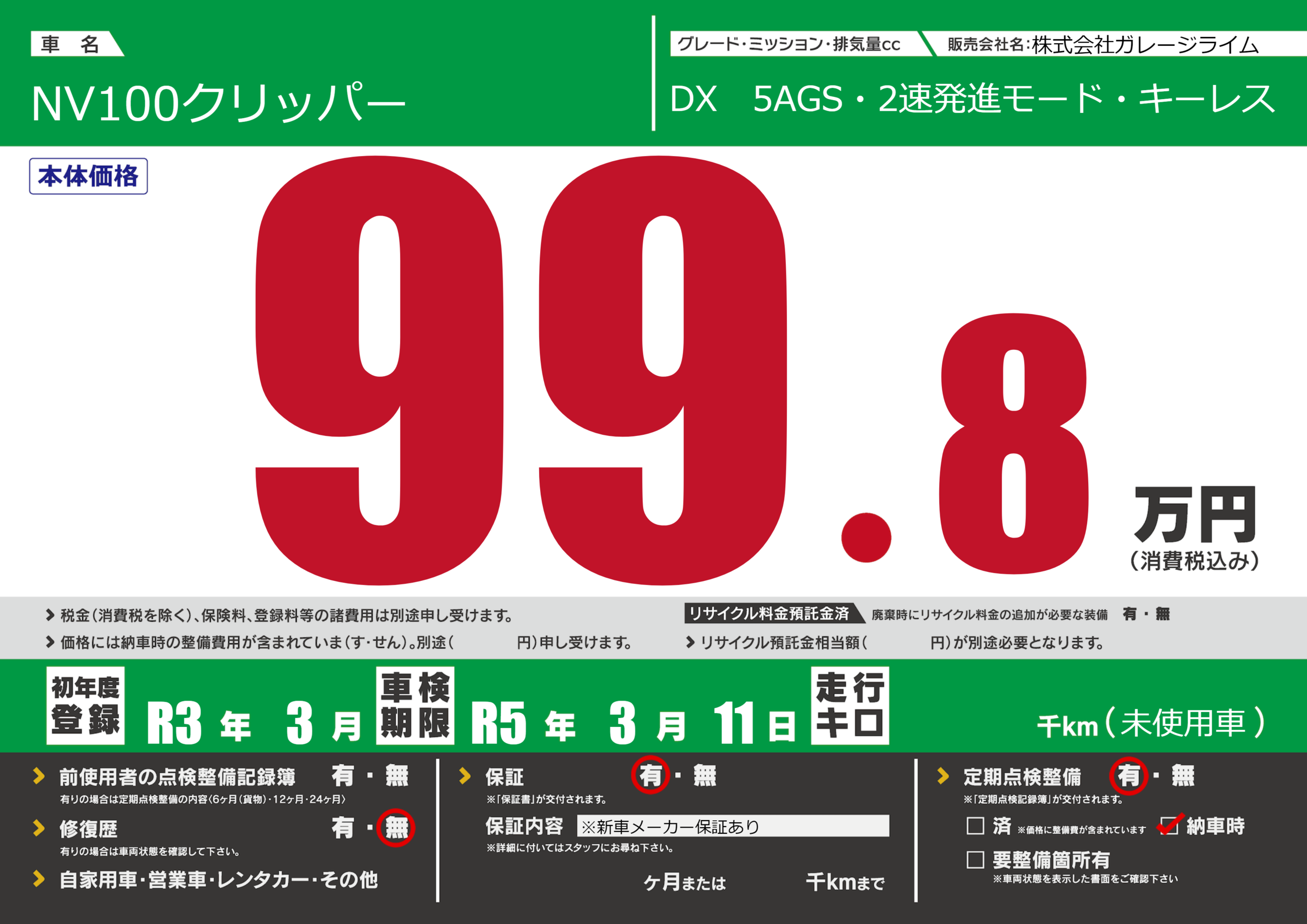 保証付き 保証内容(※新車メーカー保証あり) ---ヶ月または()千kmまで |