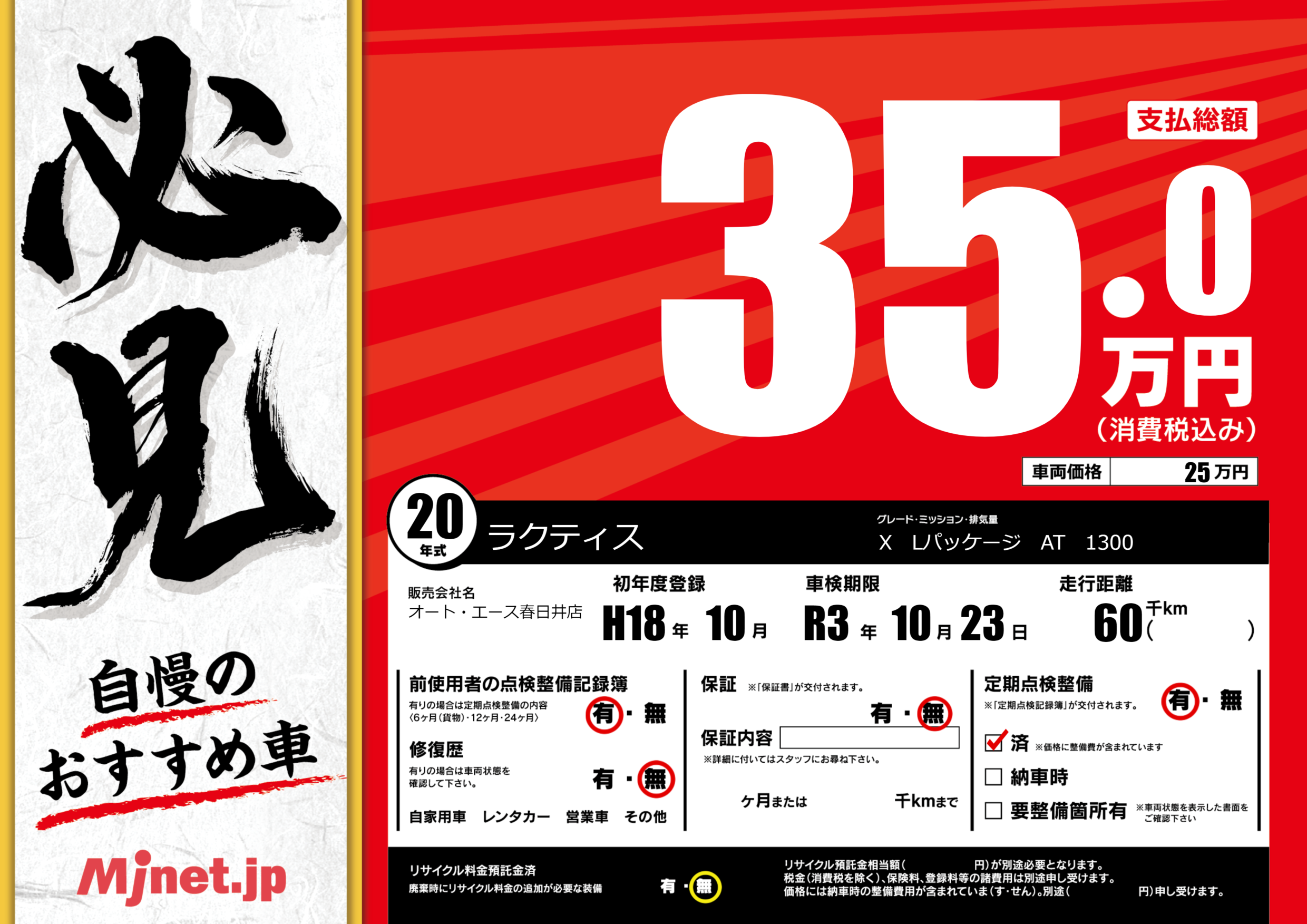 | 車名 | ラクティス | グレード ミッション 排気量 |