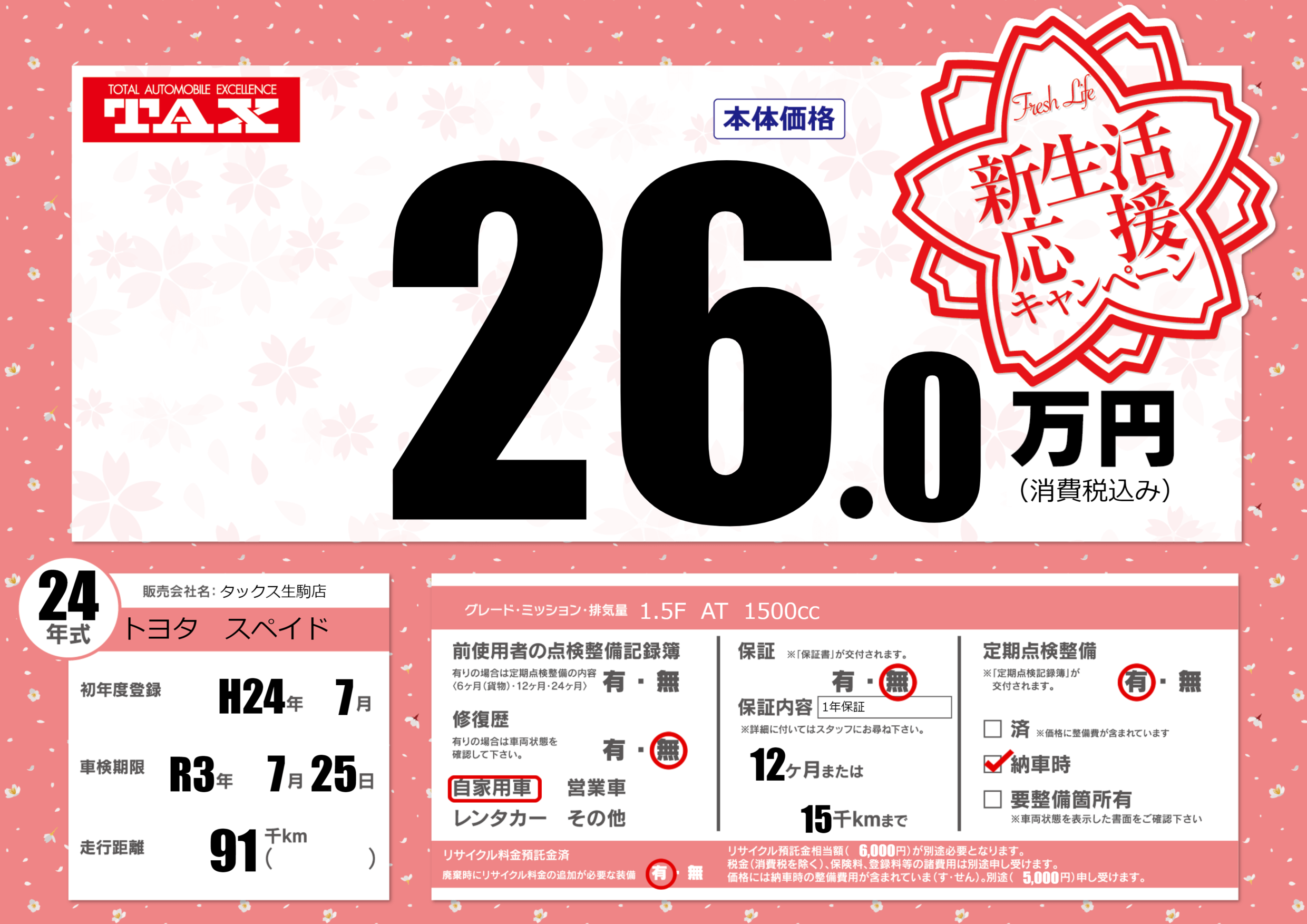 | 車名 | トヨタ スペイド | グレード ミッション 排気量 |