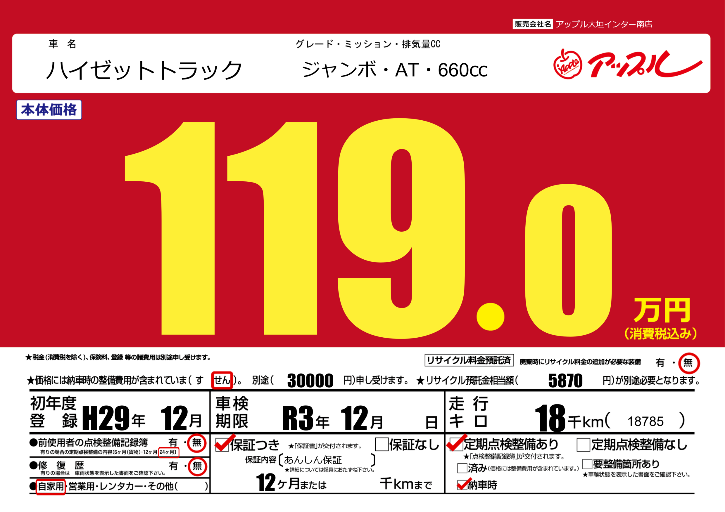 | 定期点検整備 | 定期点検整備あり 納車時あり | ||