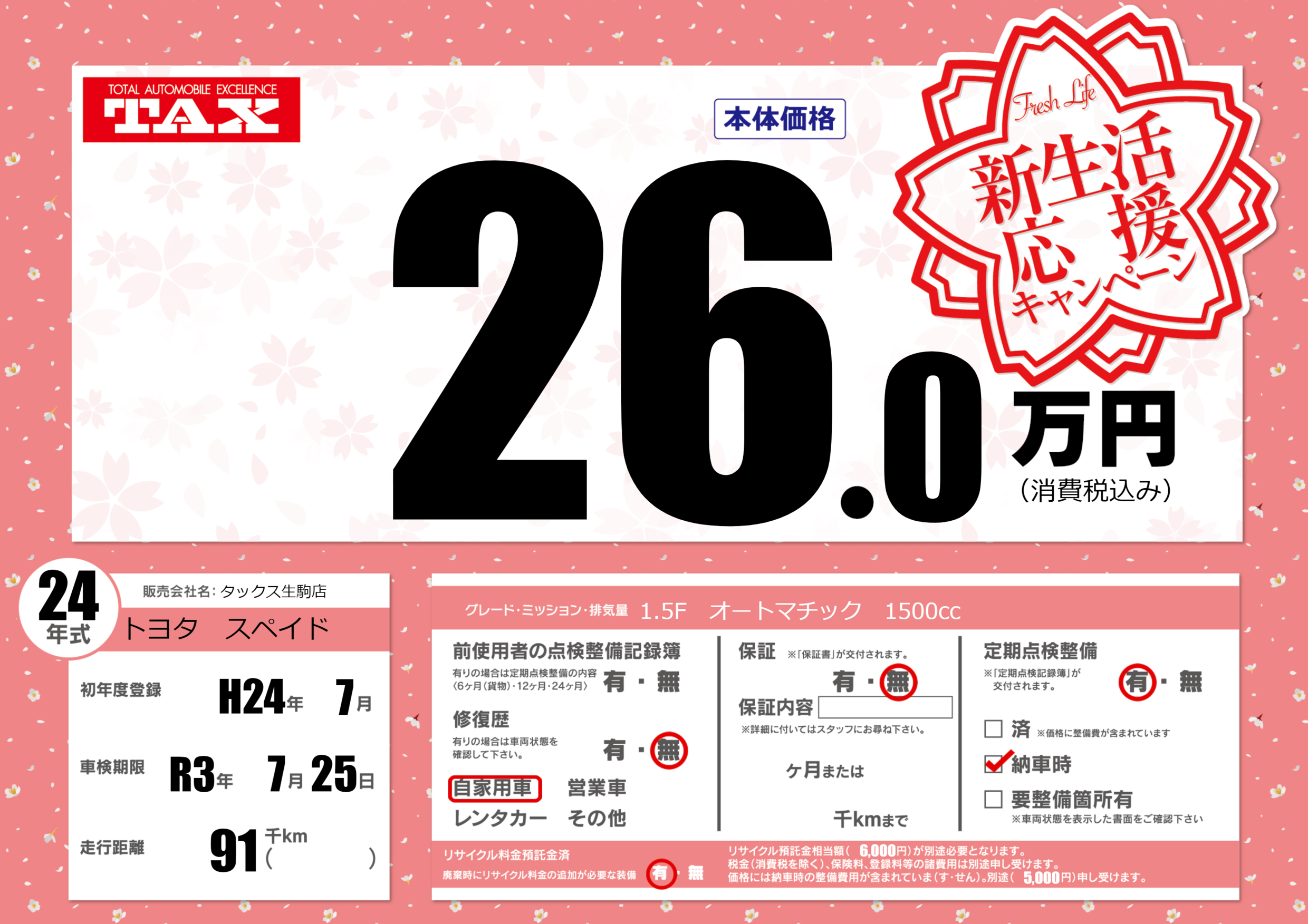 あり | リサイクル預託金相当額 | ( 1円)が別途必要 |