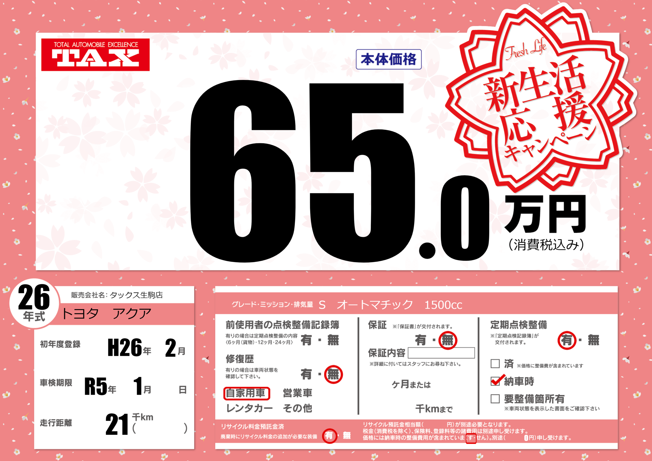 | 車名 | トヨタ アクア | グレード ミッション 排気量 |