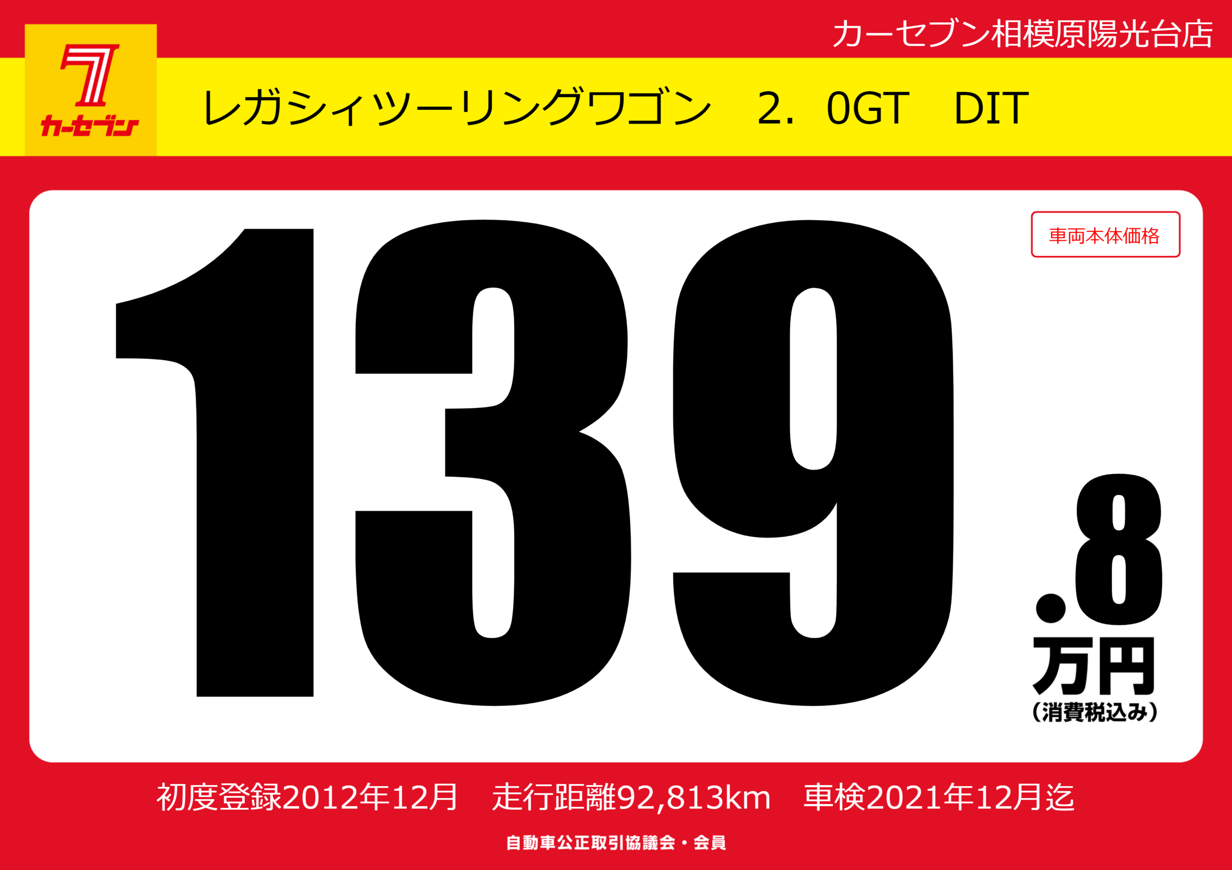 | 車名 | レガシィツーリングワゴン 2.0GT DIT | グレード ミッション 排気量 |