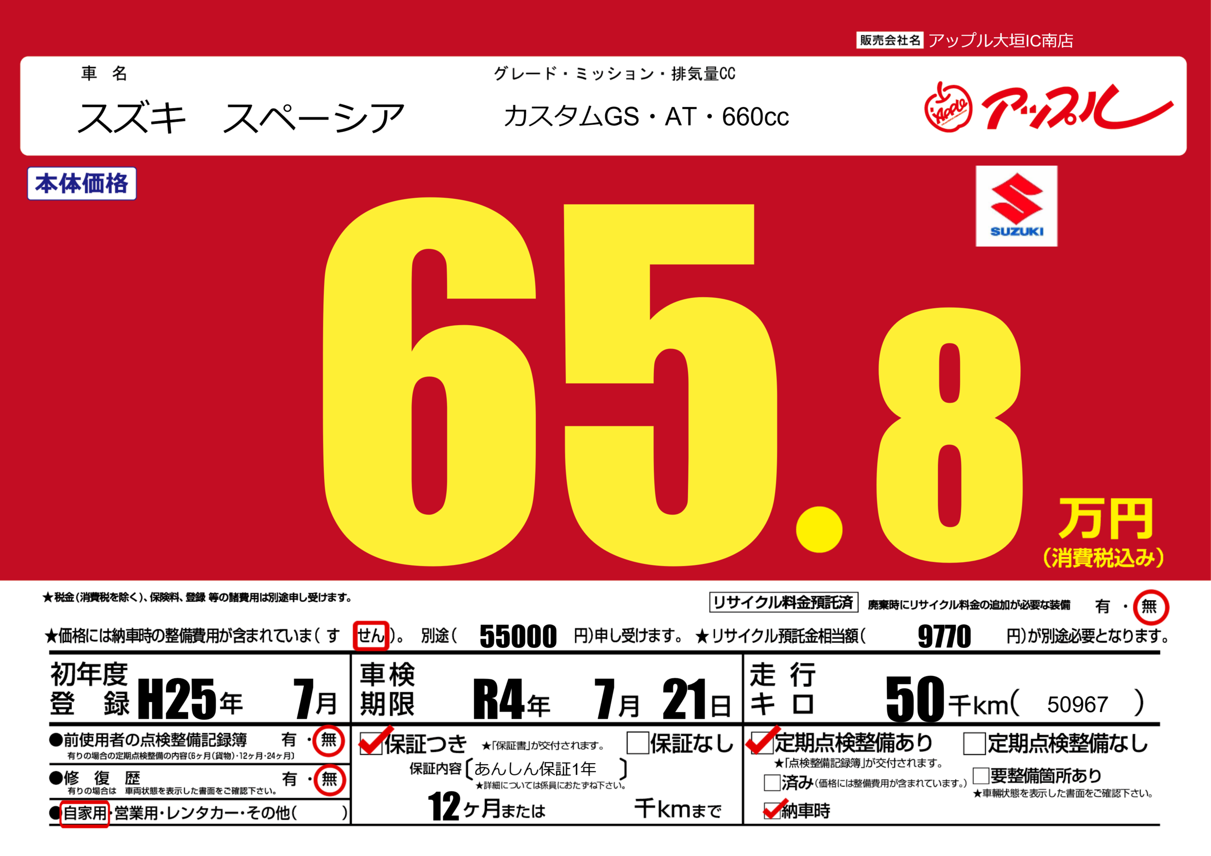 | 走行キロ | 5万km | 初年度登録 | H25年7月 |