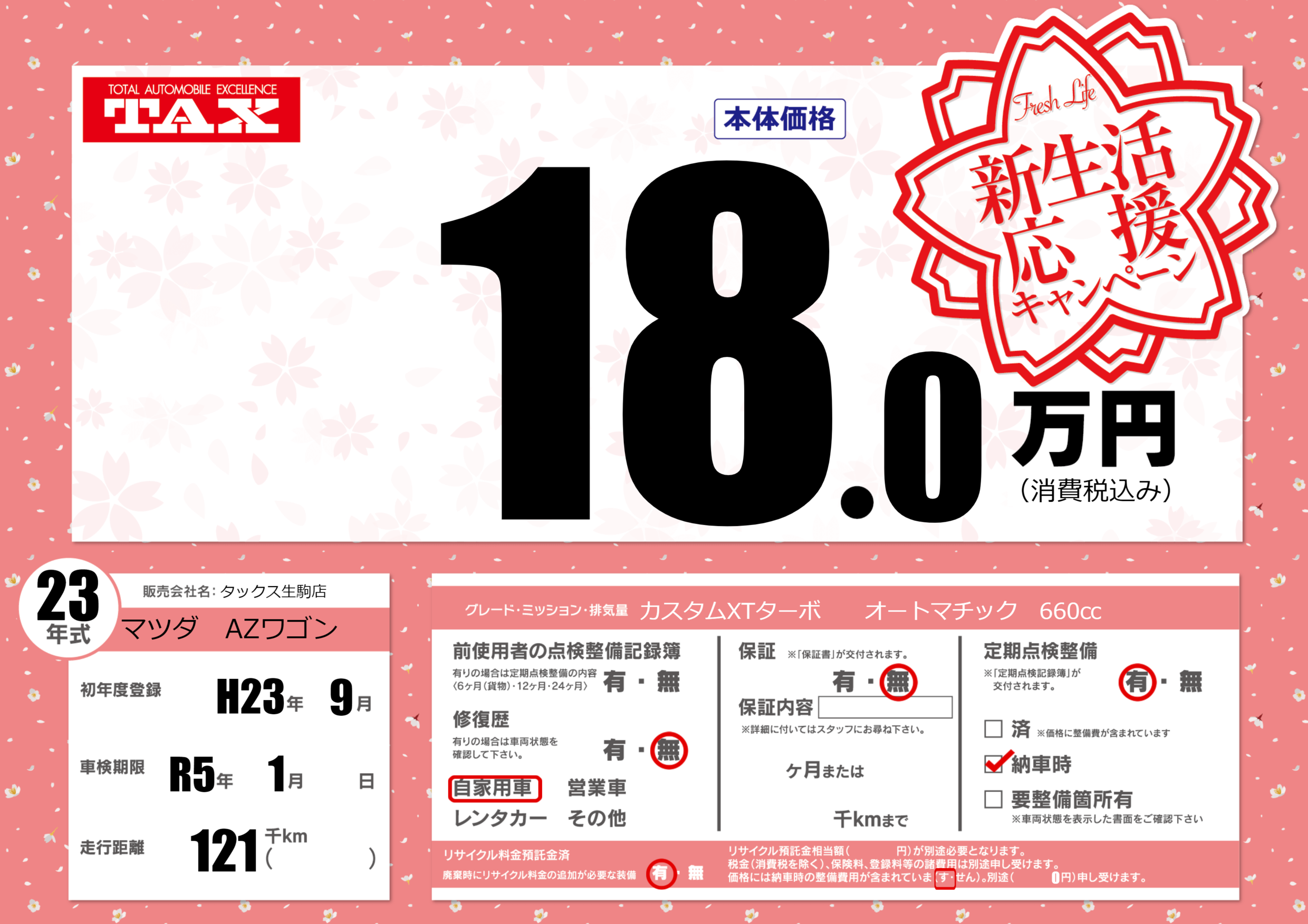 | 走行キロ | 12.1万km | 初年度登録 | H23年9月 |