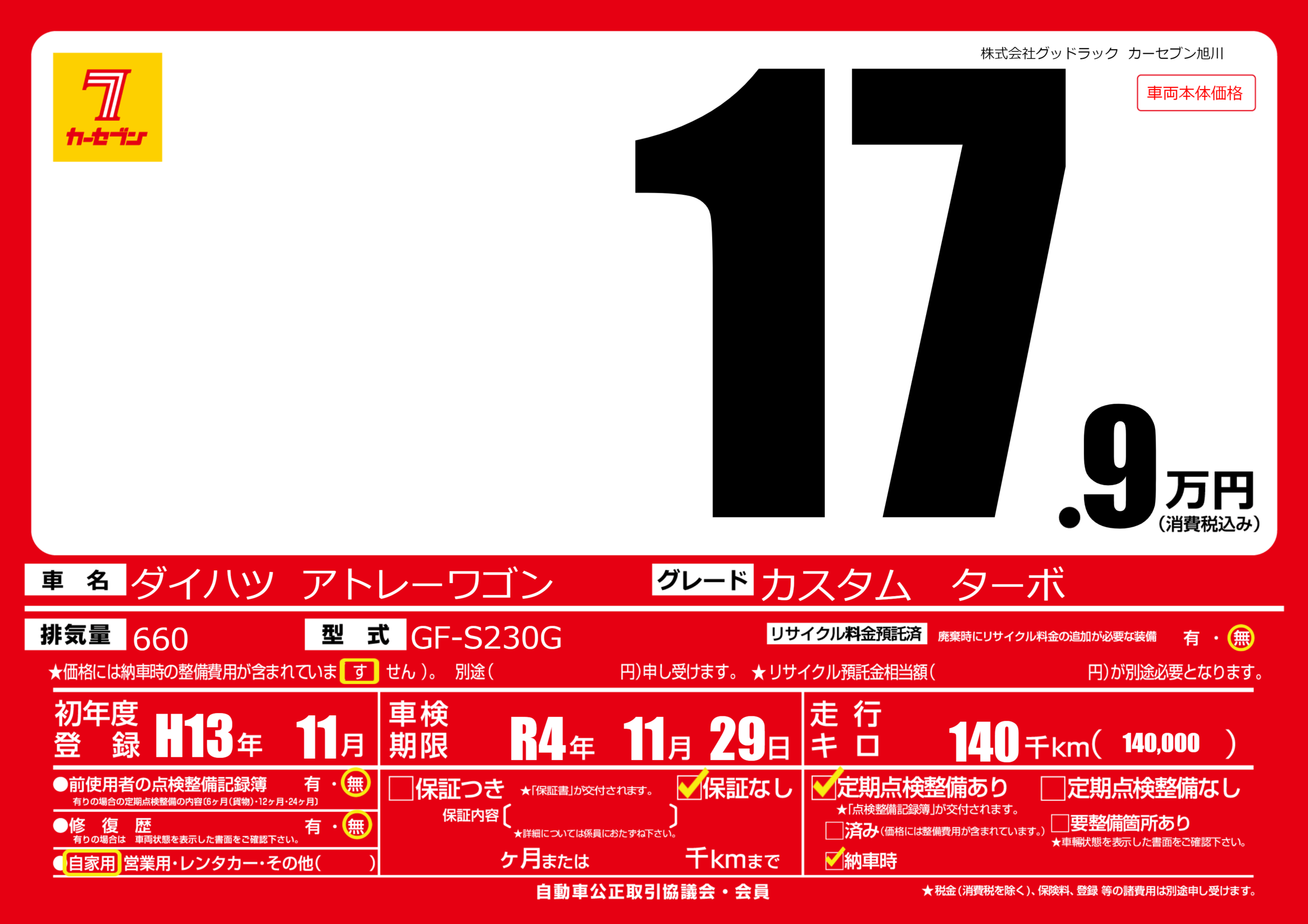 | 走行キロ | 14万km | 初年度登録 | H13年11月 |