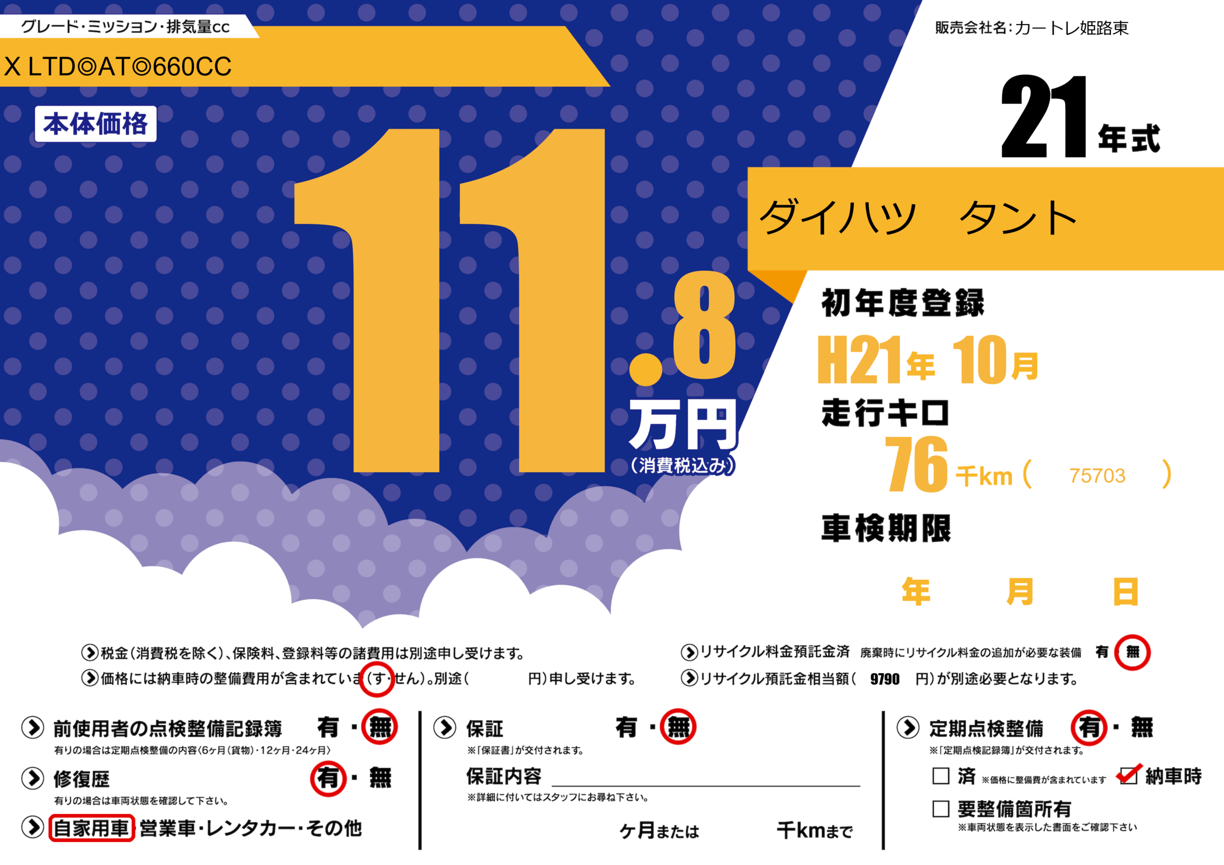 | 定期点検整備 | 定期点検整備あり 納車時あり | ||