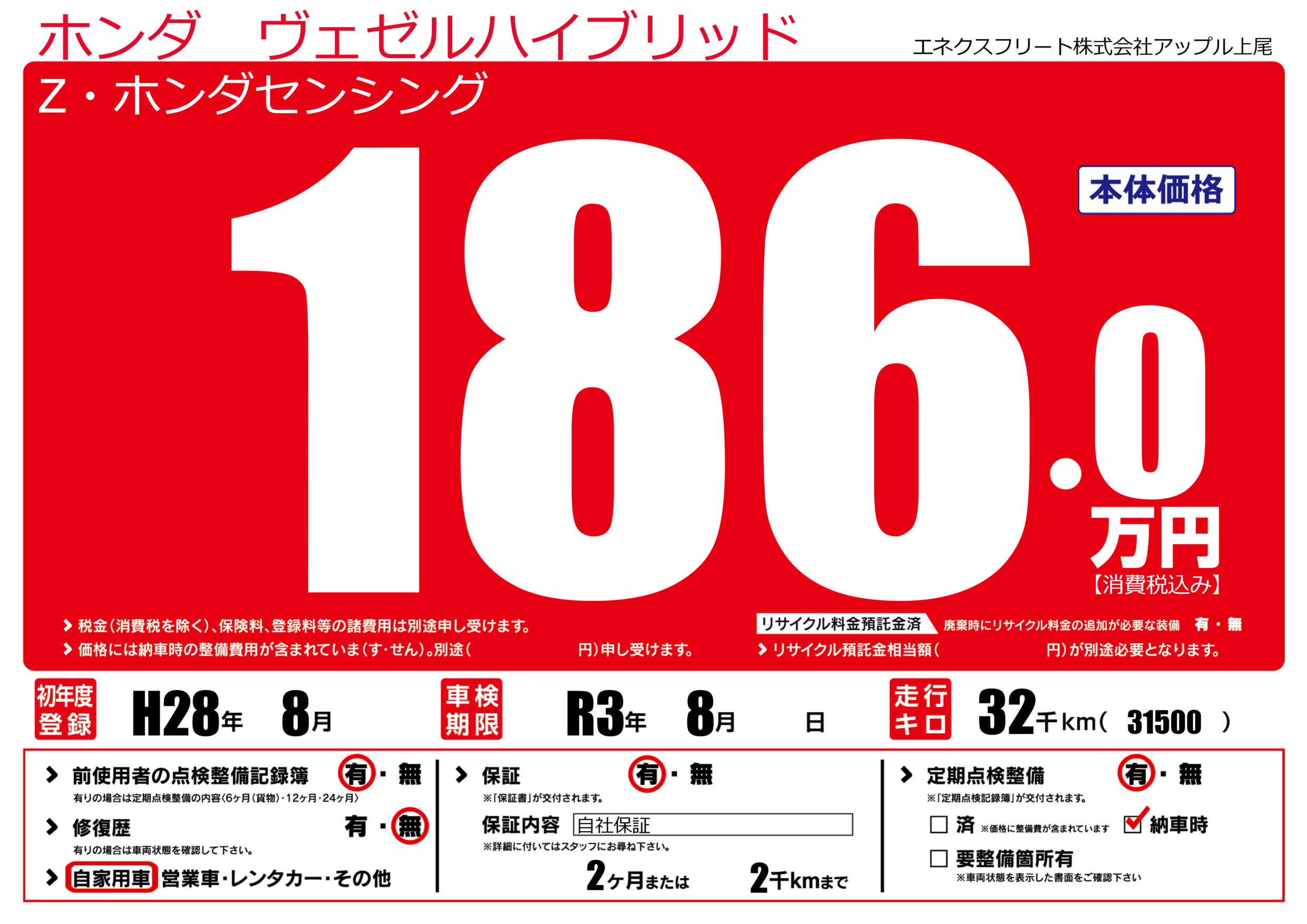 | 車名 | ホンダ ヴェゼルハイブリッド | グレード ミッション 排気量 |