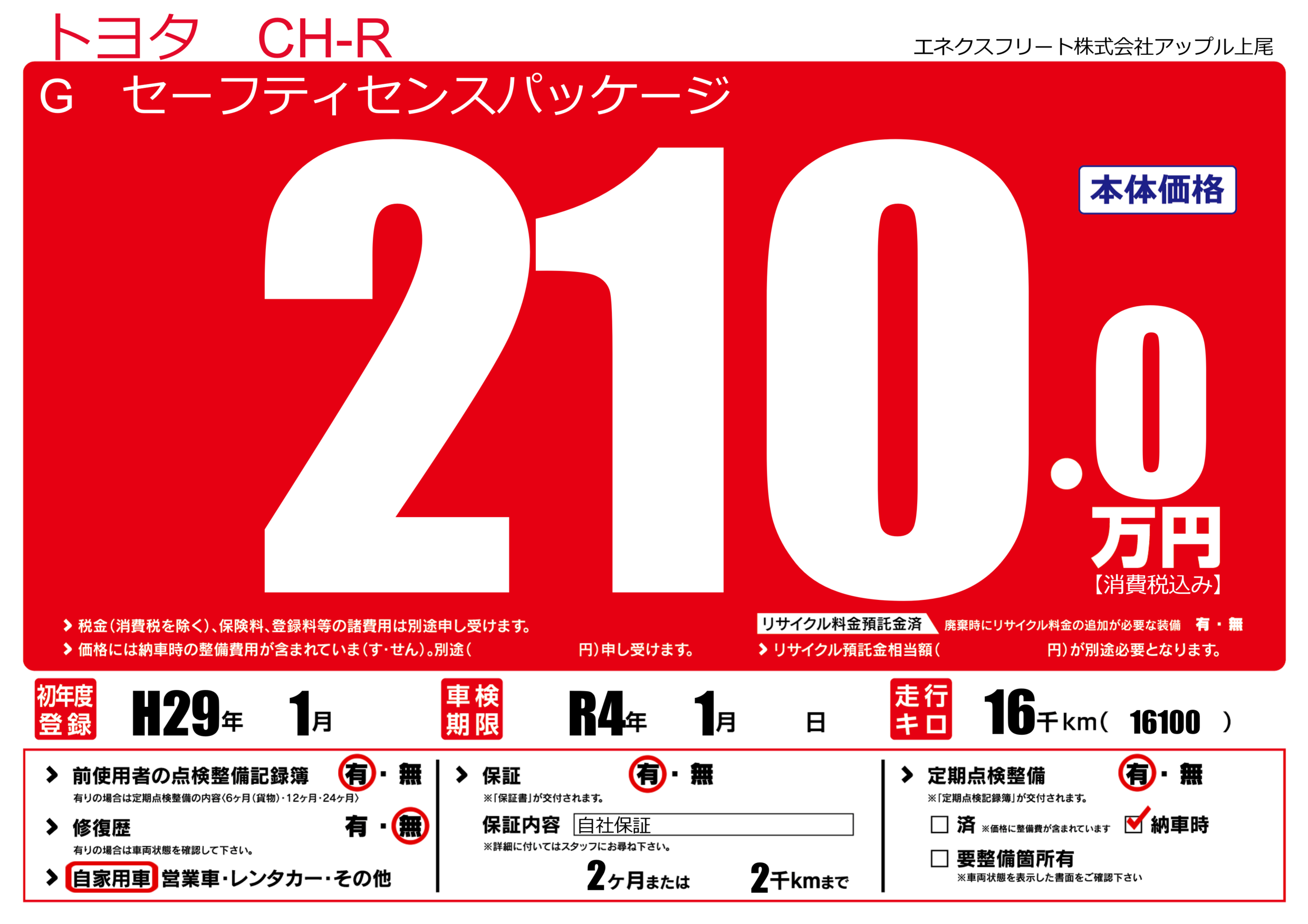 保証付き 保証内容(自社保証) 2ヶ月または(2)千kmまで |