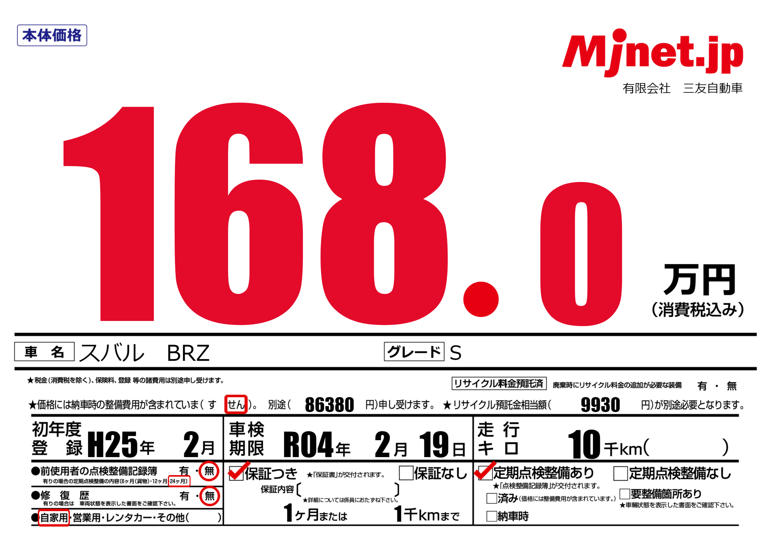 | 車名 | スバル BRZ | グレード ミッション 排気量 |