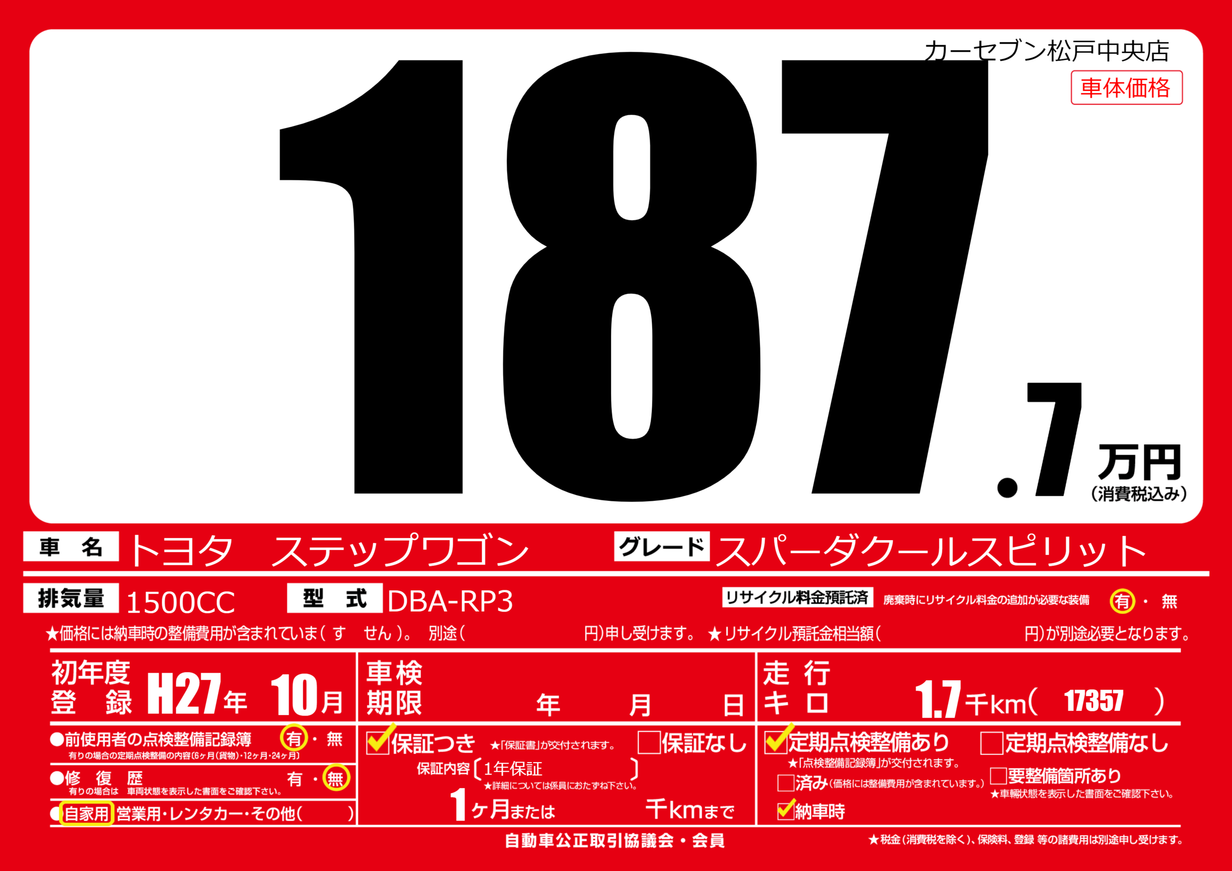| 車名 | トヨタ ステップワゴン | グレード ミッション 排気量 |
