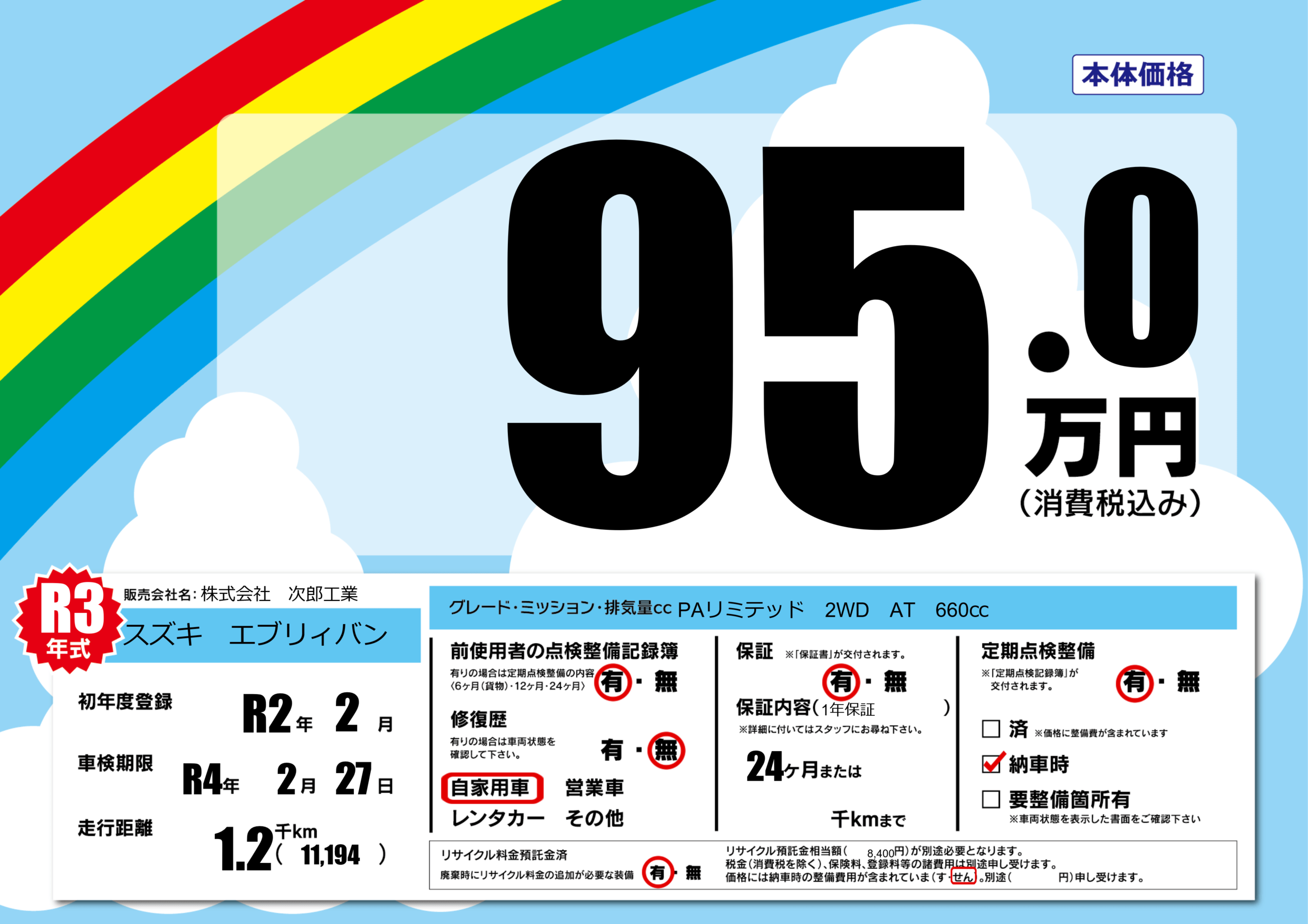 | 車名 | スズキ エブリィバン | グレード ミッション 排気量 |