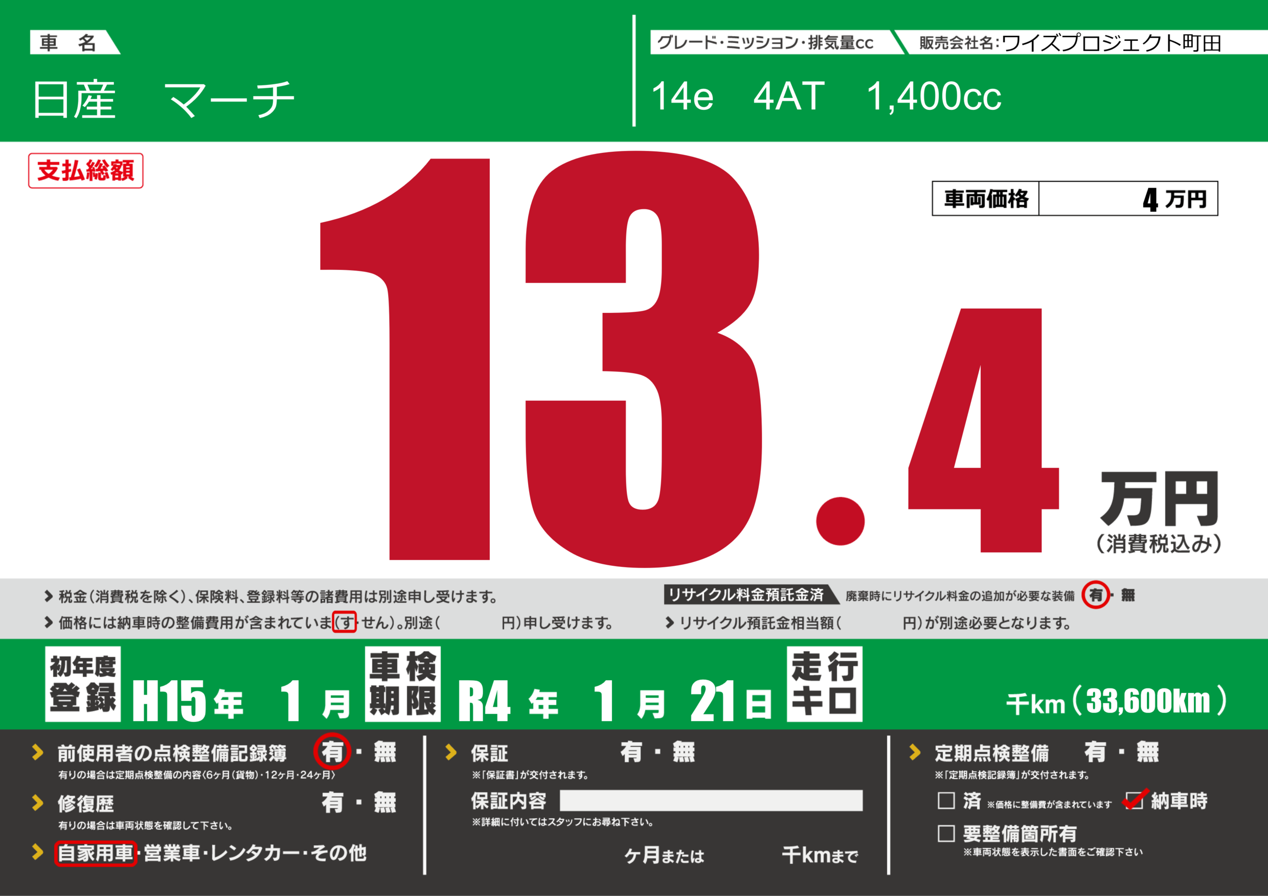 | 車名 | 日産 マーチ | グレード ミッション 排気量 |