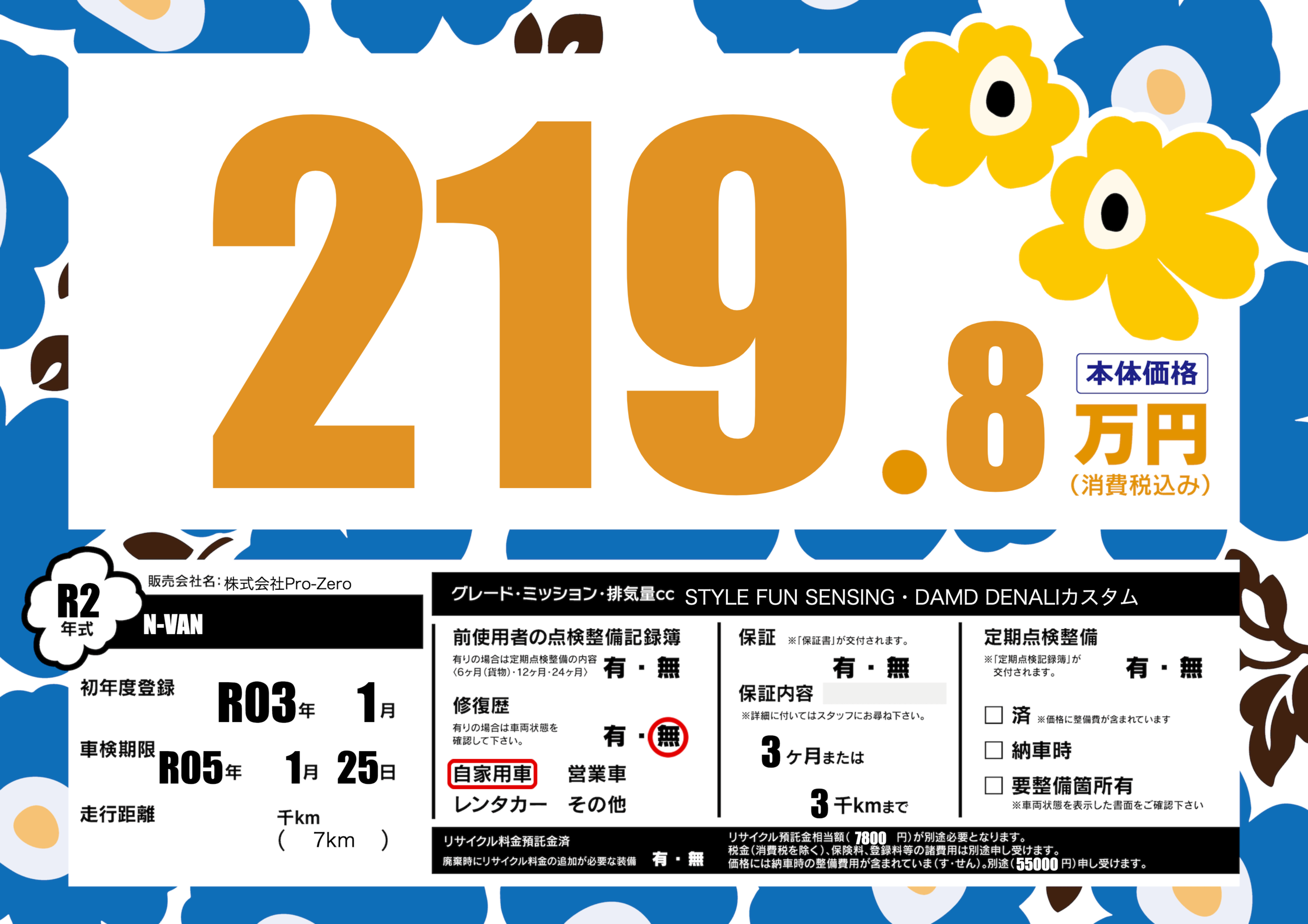 | 車名 | N-VAN | グレード ミッション 排気量 |