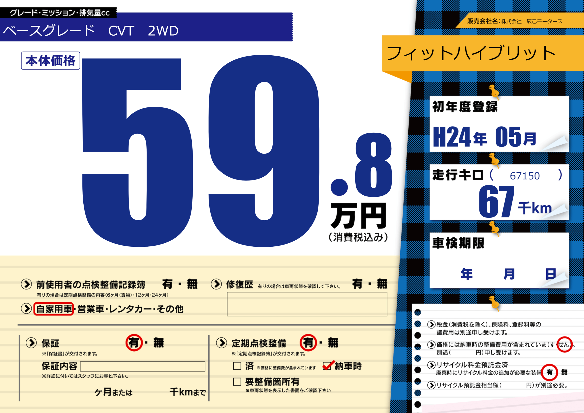 | 定期点検整備 | 定期点検整備あり 納車時あり | ||