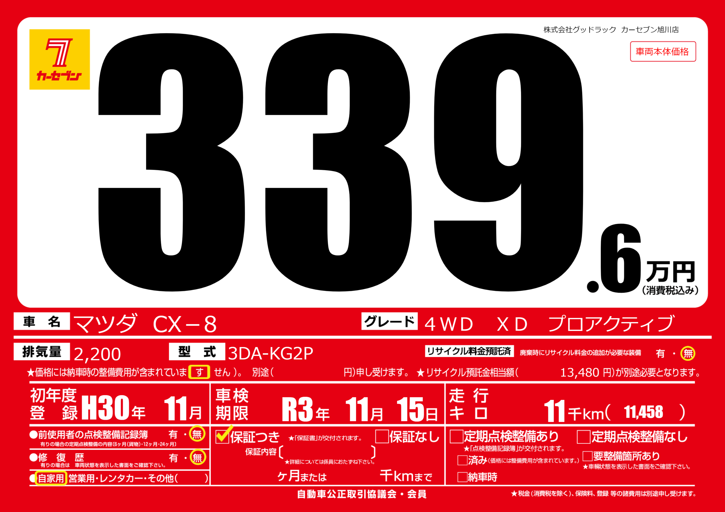 | 走行キロ | 1.1万km | 初年度登録 | H30年11月 |