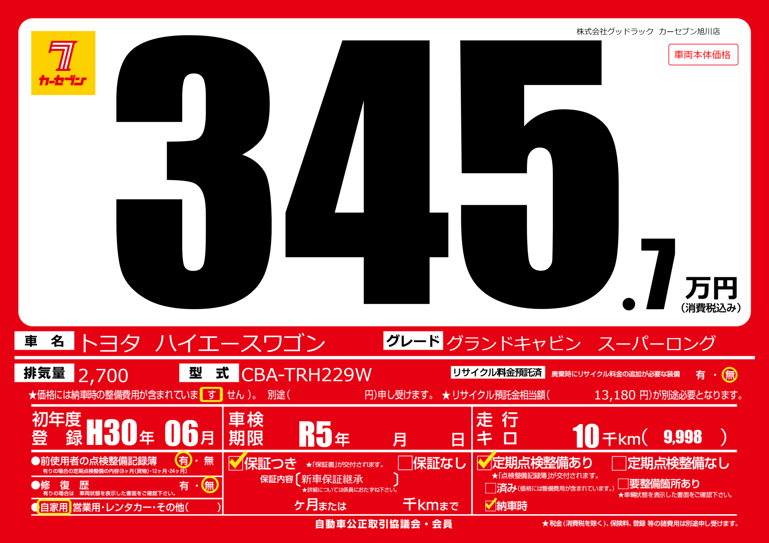 | 車名 | トヨタ ハイエースワゴン | グレード ミッション 排気量 |