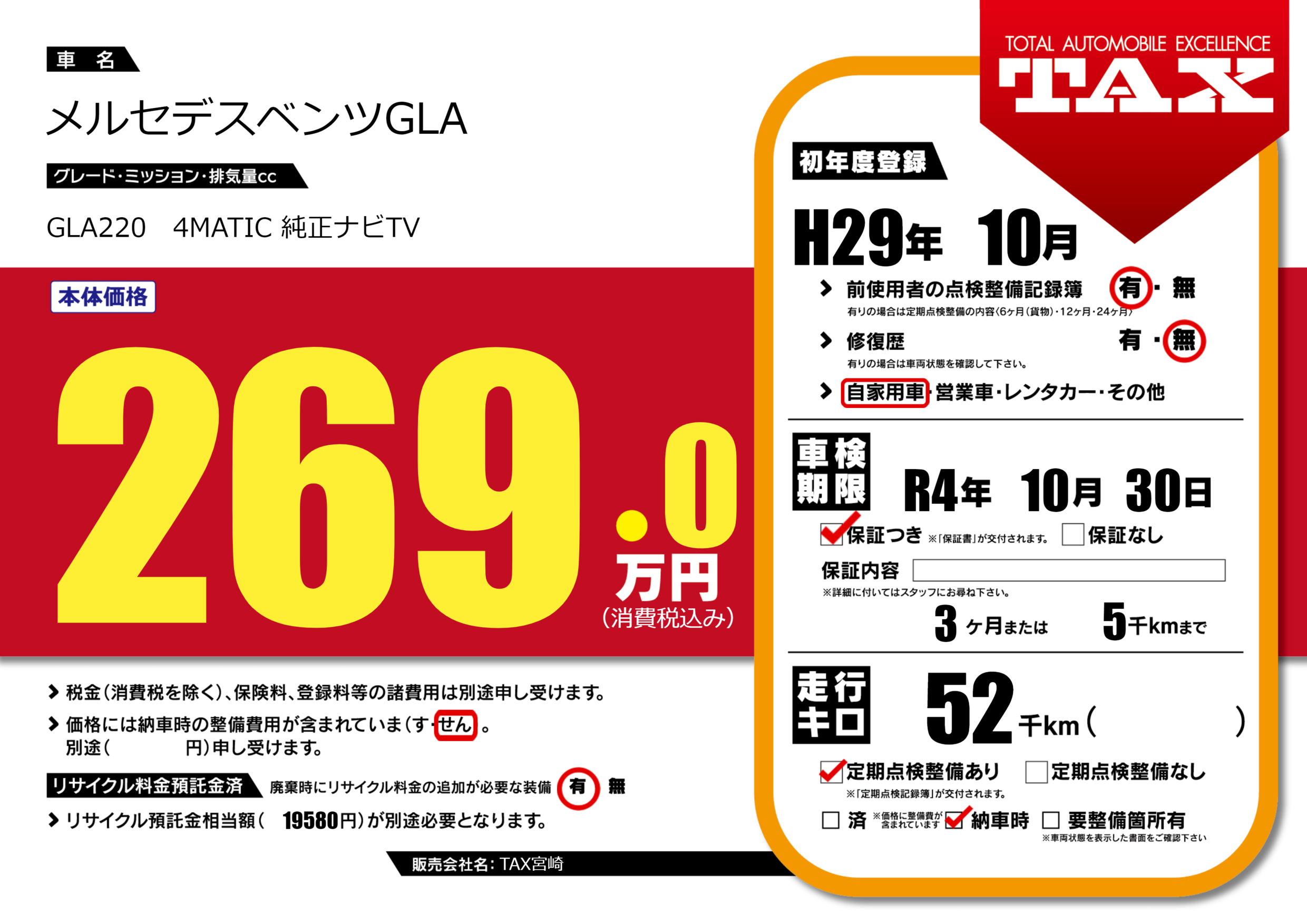| 車名 | メルセデスベンツGLA | グレード ミッション 排気量 |