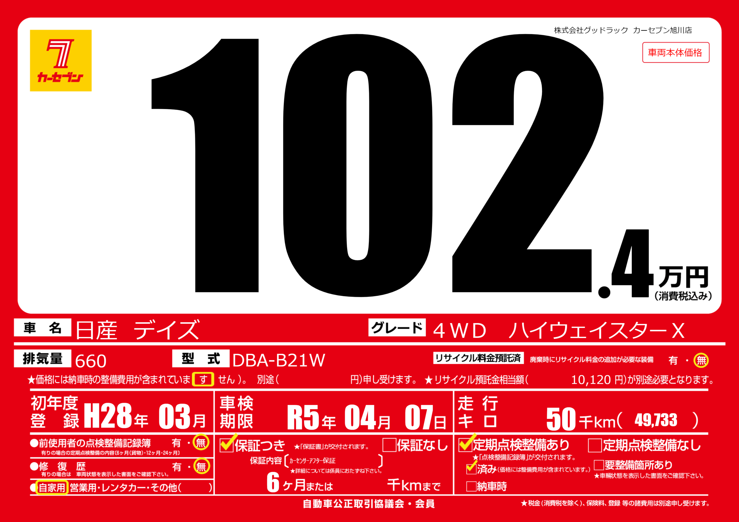 | 定期点検整備 | 定期点検整備あり 定期点検整備済み | ||