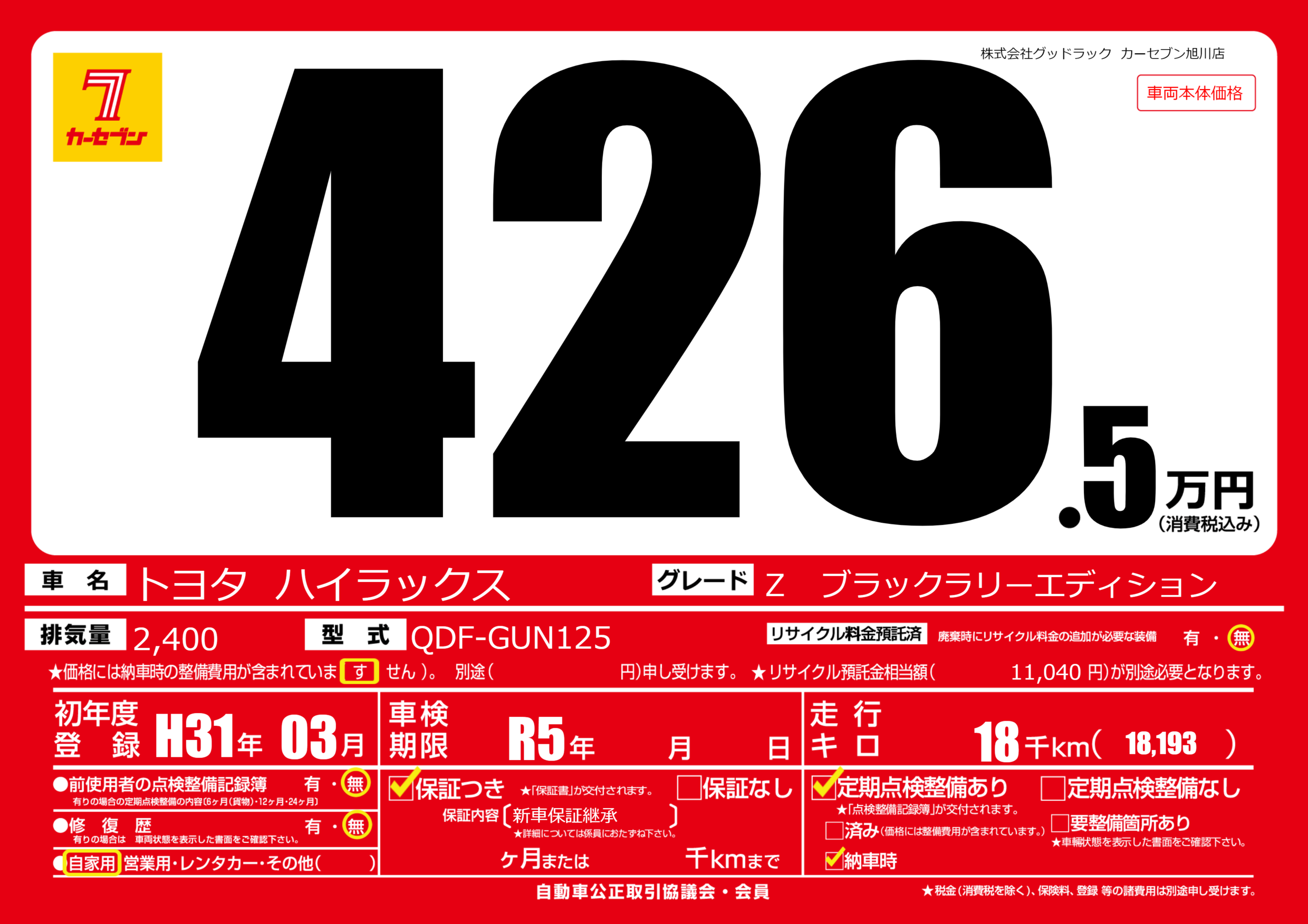 | 車名 | トヨタ ハイラックス | グレード ミッション 排気量 |