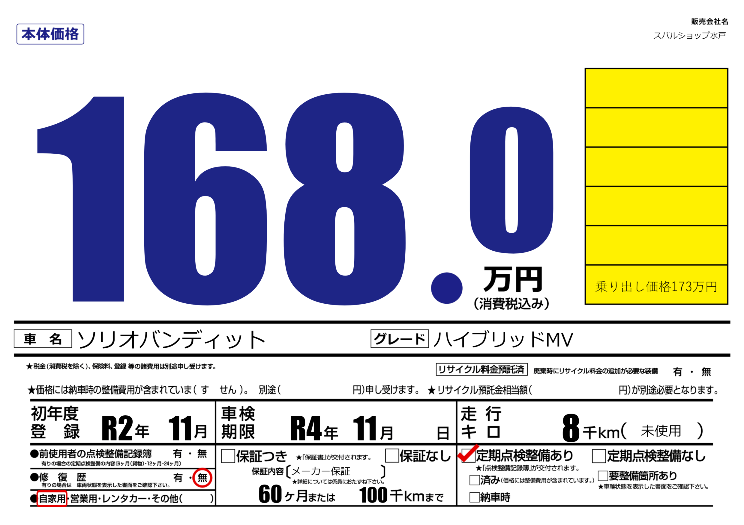 なし | 車検制限 | R4年11月---月 |