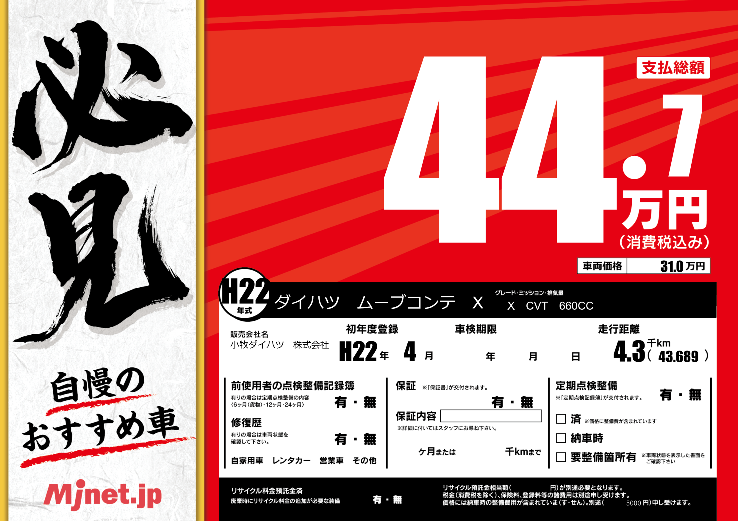 | 車名 | ダイハツ ムーブコンテ X | グレード ミッション 排気量 |