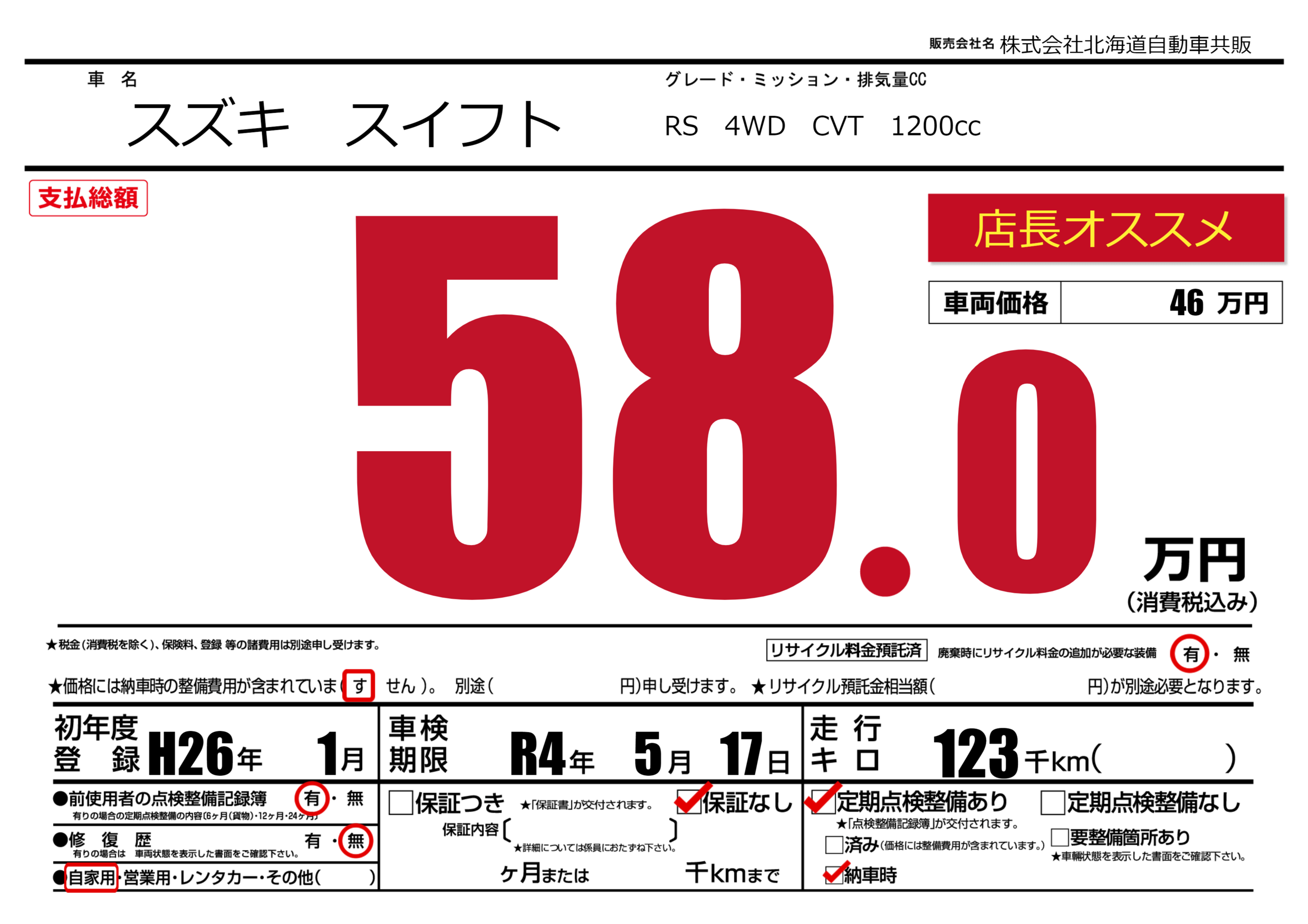 | 車名 | スズキ スイフト | グレード ミッション 排気量 |