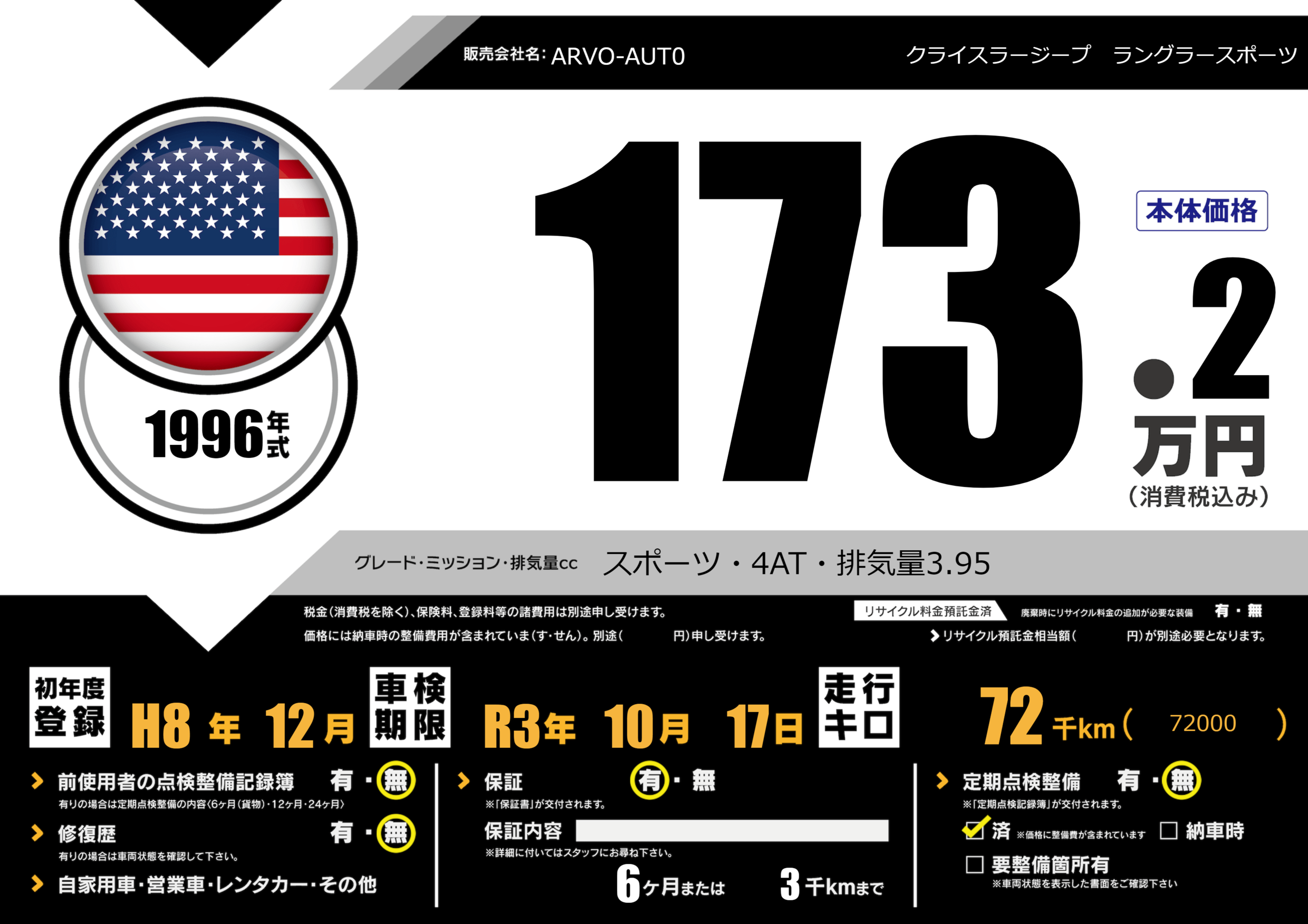 | 車名 | クライスラージープ ラングラースポーツ | グレード ミッション 排気量 |