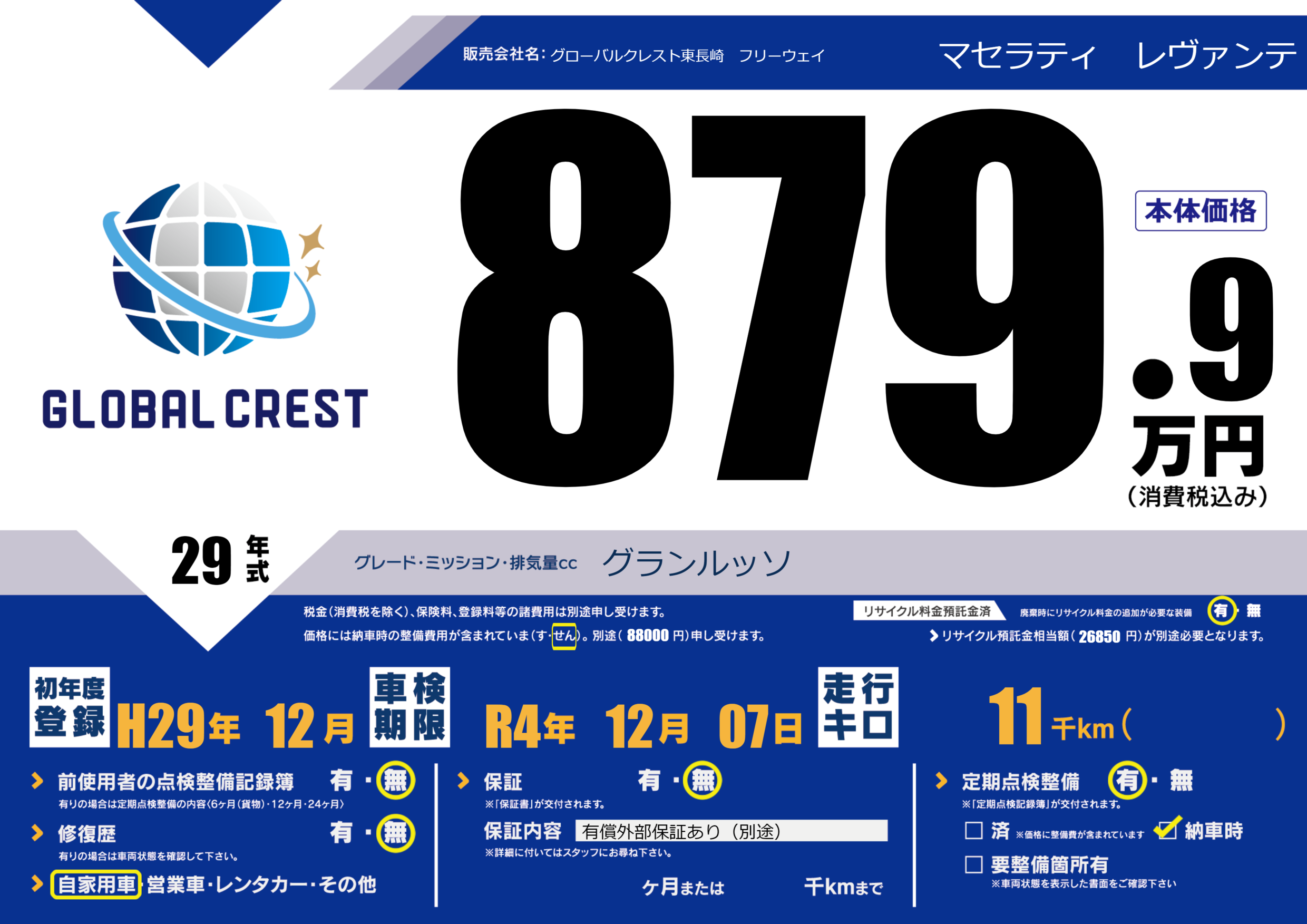 | 車名 | マセラティ レヴァンテ | グレード ミッション 排気量 |