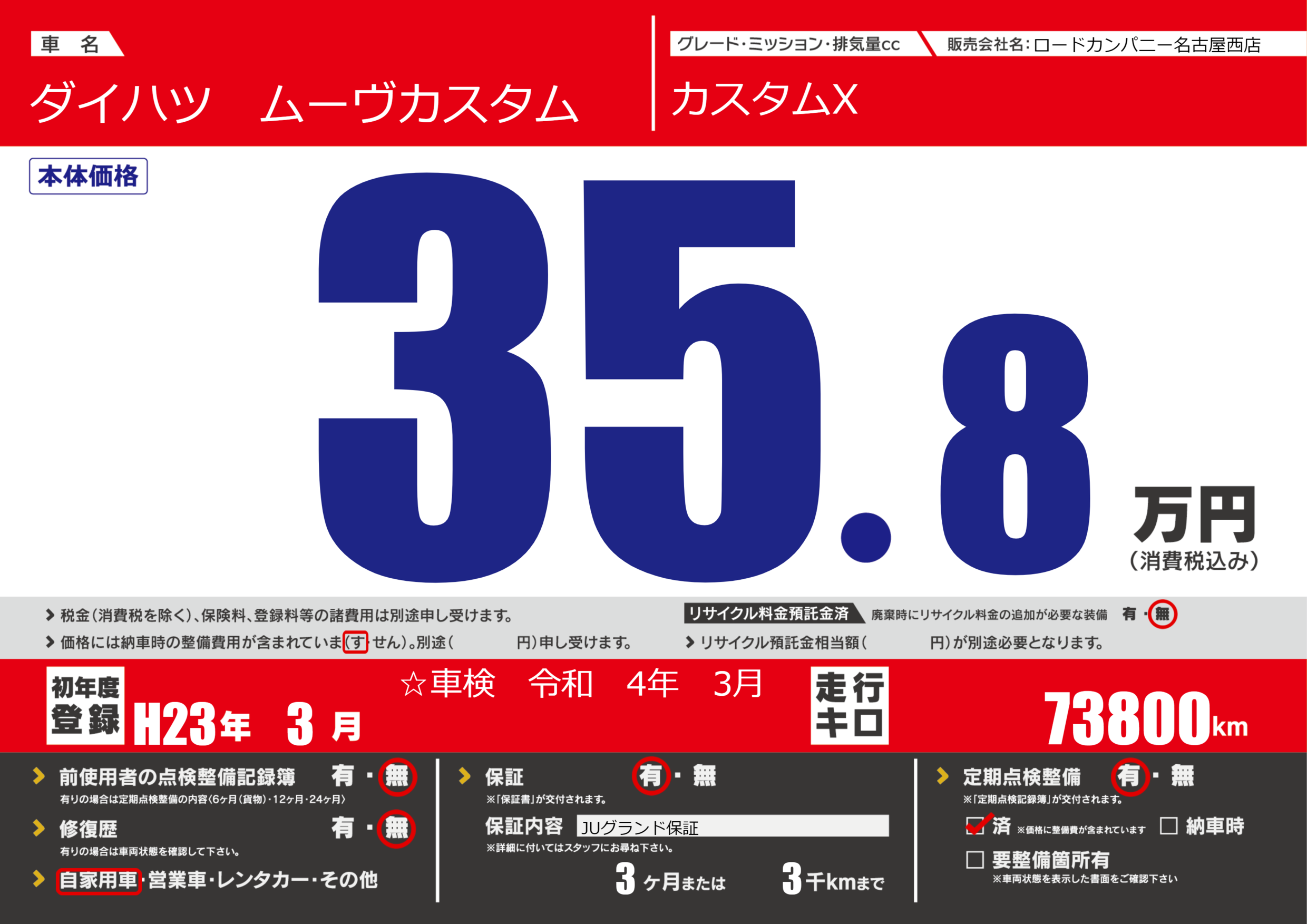 | 定期点検整備 | 定期点検整備あり 定期点検整備済み | ||